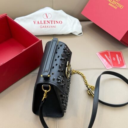 Valentino V-Logo Chain Bag – Black & Brown Two-Tone Leather Shoulder Crossbody Bag, Light Luxury Evening-Style Women’s Bag(24*16/19.5*13)