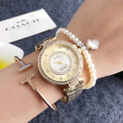 This Coach watch collection features dazzling crystal embellishments, polished metal bracelets, and the brand’s iconic carriage logo. Crafted with Coach’s