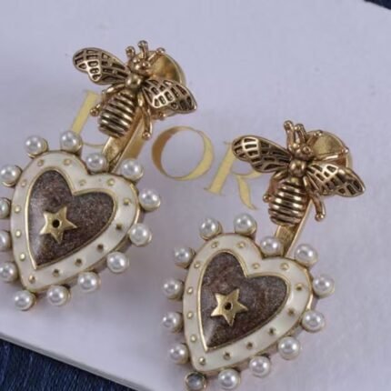 These Dior earrings blend whimsical charm with luxury craftsmanship, featuring intricate bee motifs, heart-shaped pendants with star detailing, and delicate