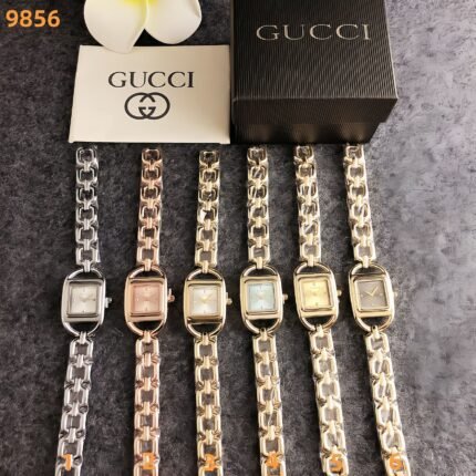 Gucci 9856 series watches embody vintage elegance with signature Gucci flair. Featuring rectangular dials, distinctive chain-link bracelets, and refined tones