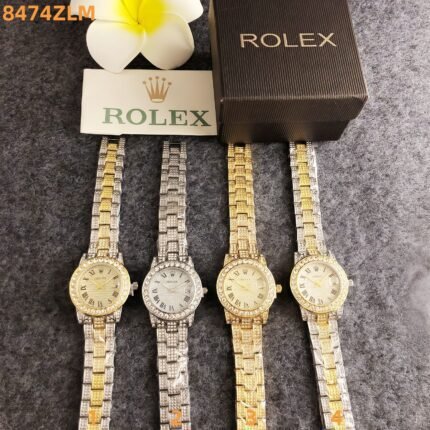 Rolex 8474ZLM series watches embody opulent luxury, featuring round dials with classic Roman numerals, dazzling crystal embellishments, and sleek metal