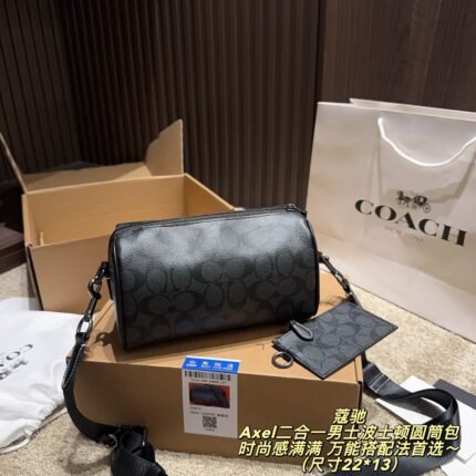 COACH Axel 2-in-1 Men’s Boston Barrel Bag: Signature Monogram with Versatile Styling (22×13cm)