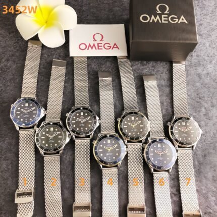 Omega 3452W series watches embody timeless dive-watch heritage with modern sophistication, featuring distinctive circular dials, sleek mesh metal bracelets, and