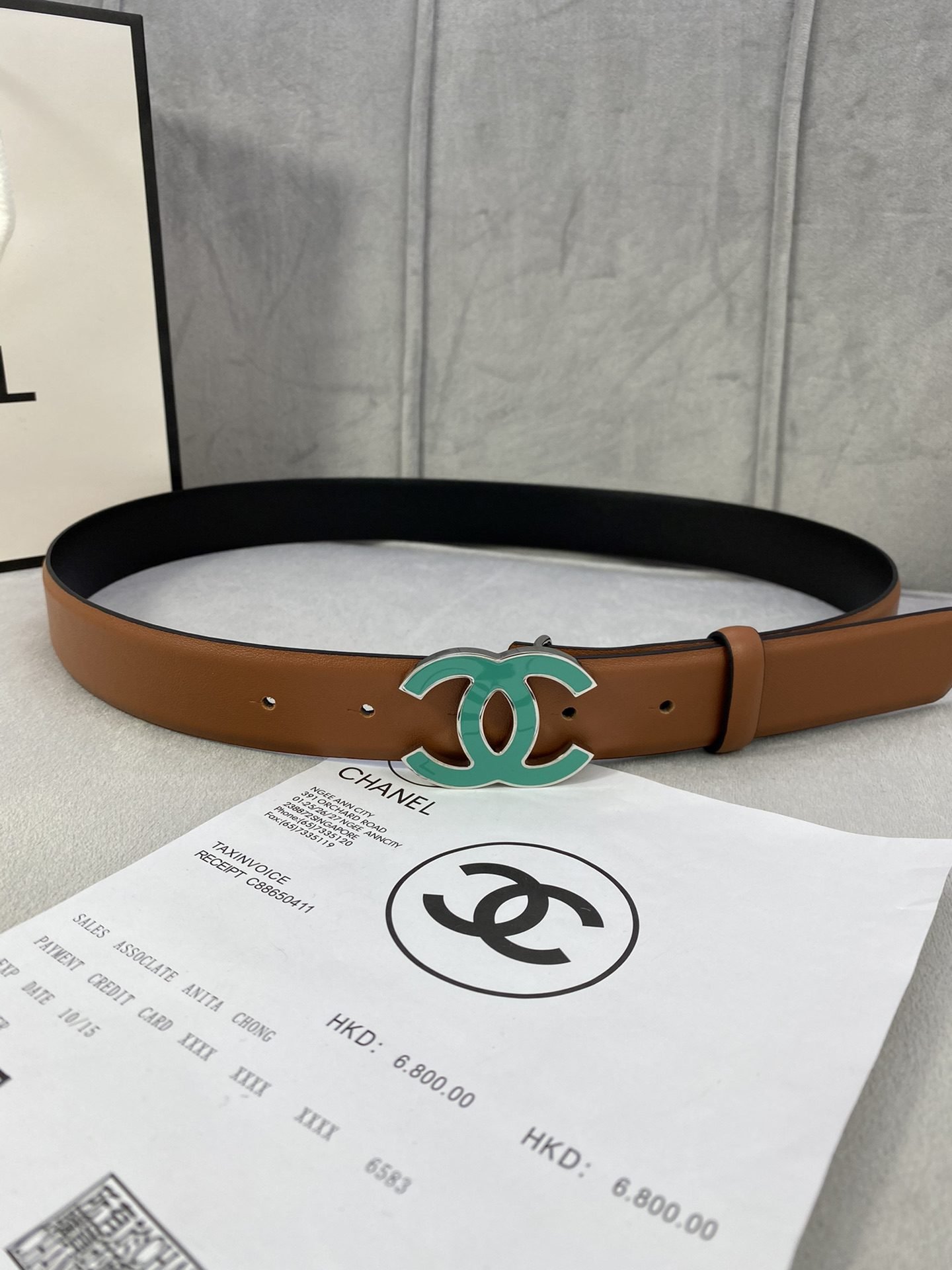 Chanel green double C-ring buckle brown belt, simple, atmospheric, exquisite and elegant
