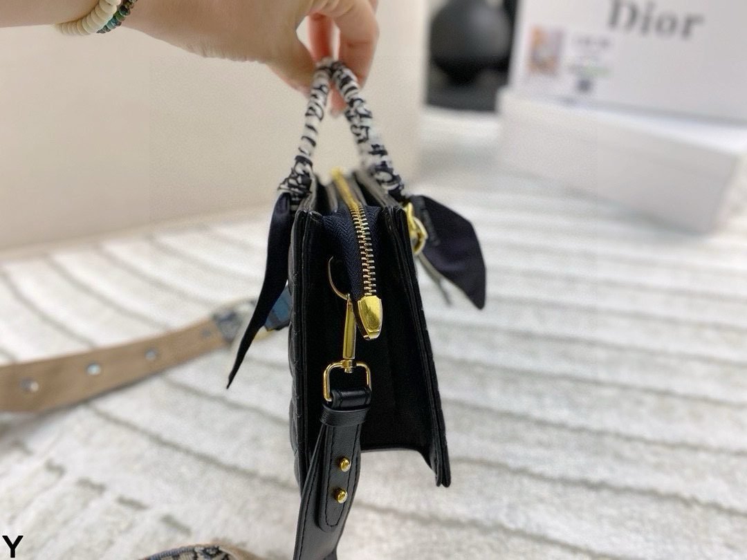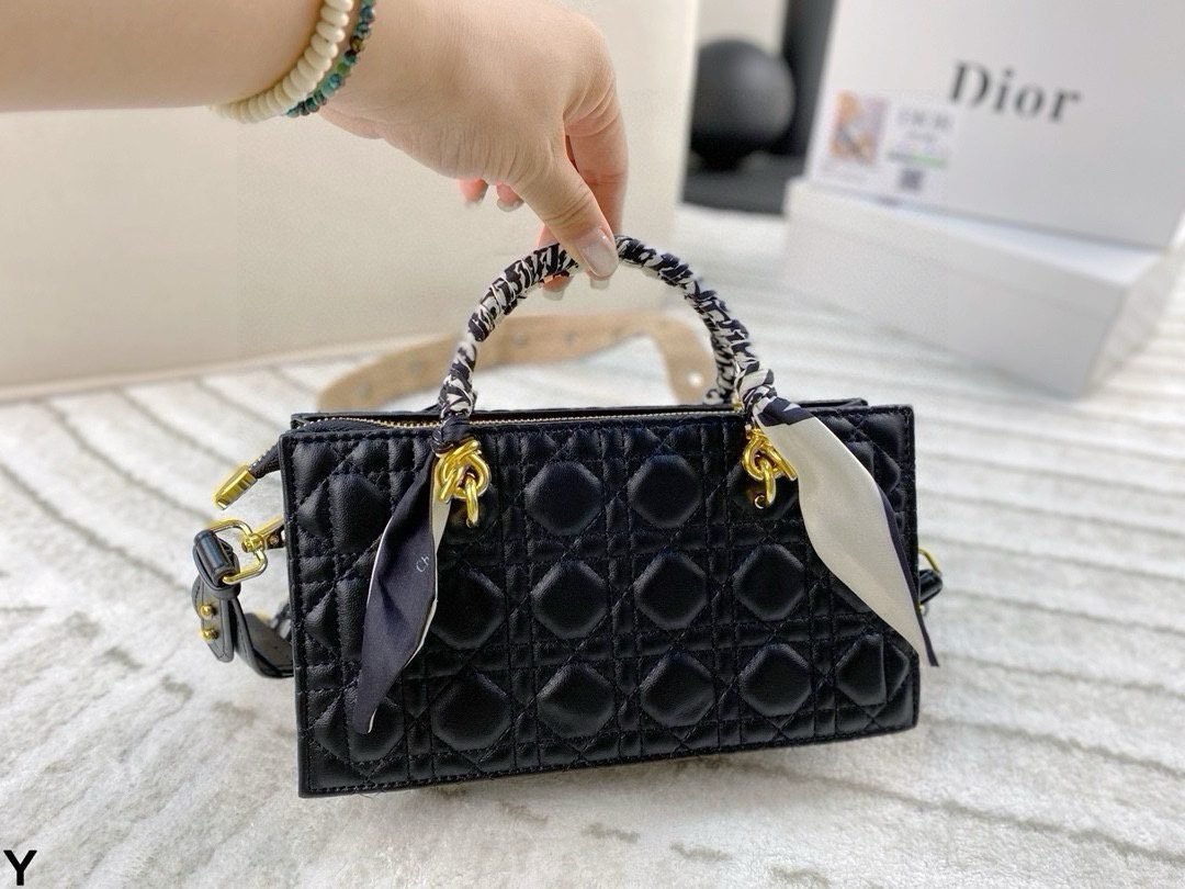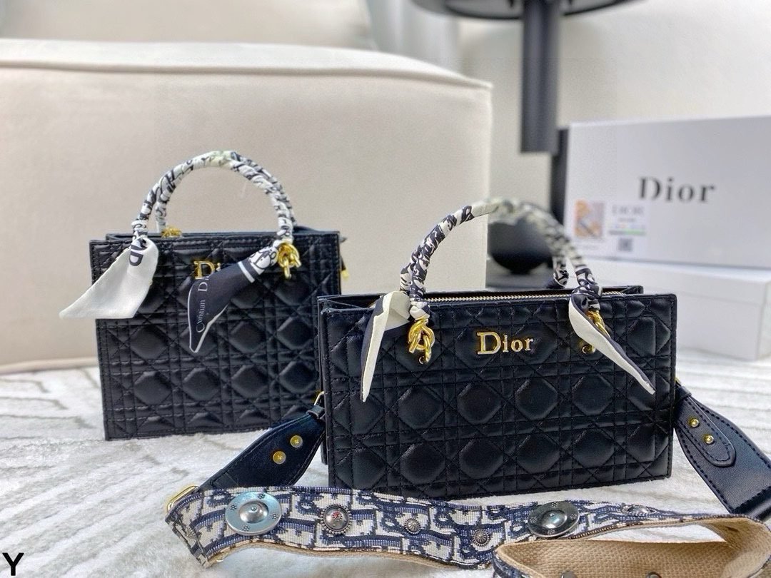 This Dior quilted leather bag set showcases the iconic Cannage pattern, featuring a horizontal and vertical style with gold-tone “Dior” branding and versatile scarf-accented handles. Available in two sizes (horizontal:24×13cm, vertical:20×16cm) in a timeless black hue, these bags embody Dior’s legacy of sophisticated elegance and functional design. Perfect for those who appreciate a fusion of iconic quilting, brand detailing, and versatile styling, they make a refined statement suitable for any occasion, from daily outings to upscale events.
