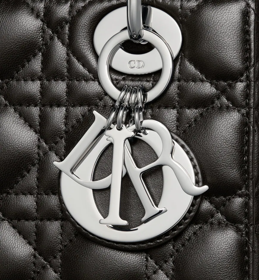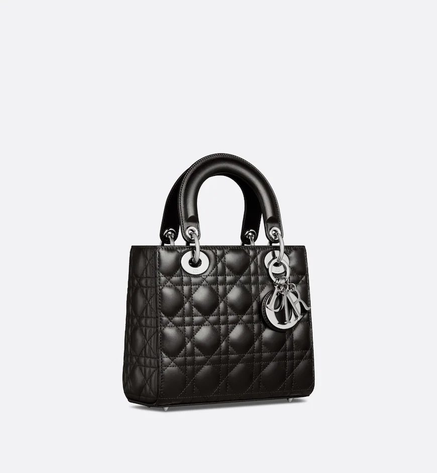 The Lady Dior My ABCDior bag epitomizes Dior’s vision of elegance and beauty. Sleek and refined. the timeless style is crafted in black lambskin with Cannage stitching. creating the instantly recognizable quilted texture. Silver-finish metal D.I.O.R. charms further embellish its silhouette with an elegant touch. Featuring a shoulder strap that can be personalized with badges. the small. unique design may be carried by hand or worn crossbody.