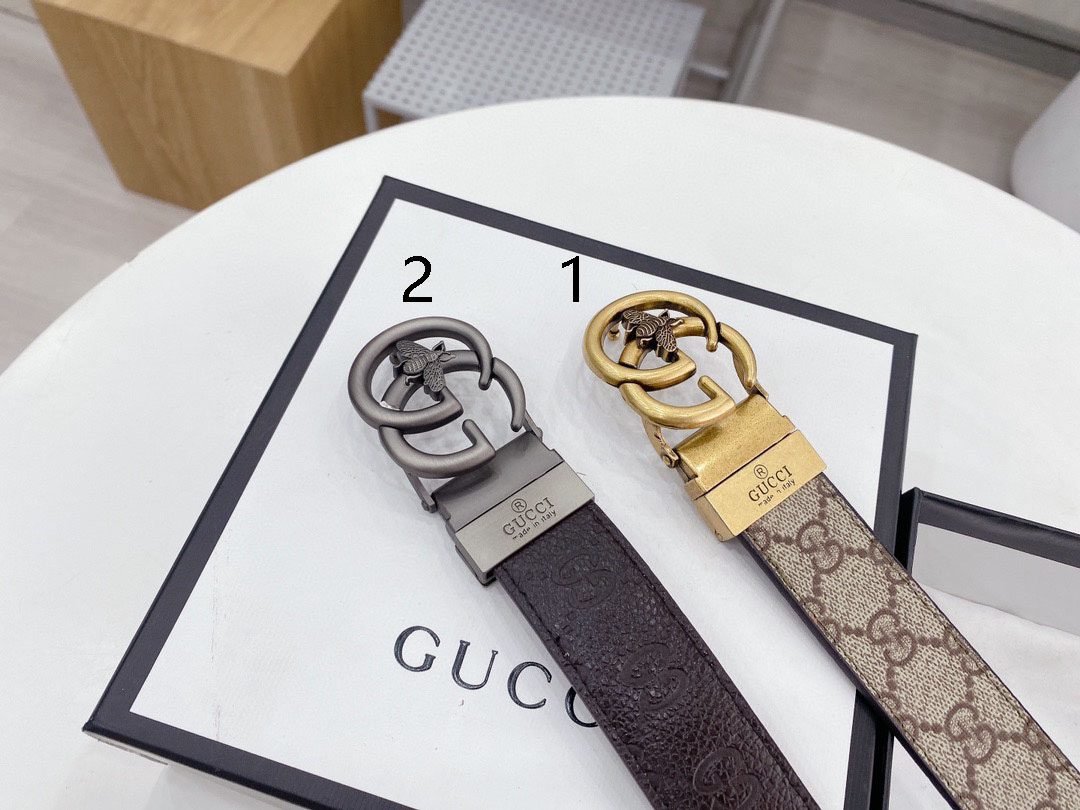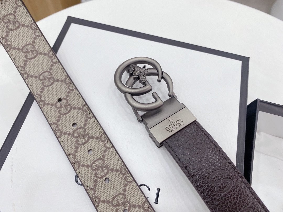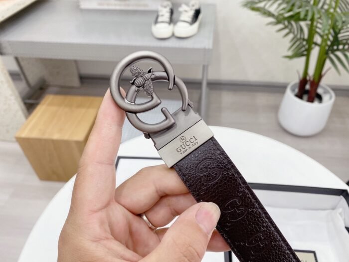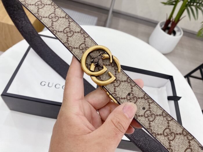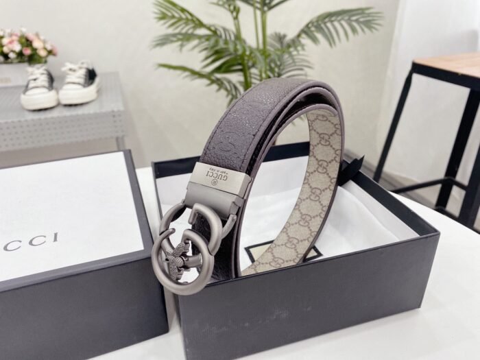 The Gucci bee double G buckle brown and beige intertwined belt demonstrates unparalleled luxury and taste with its unique design and exquisite craftsmanship. The belt is made of high-quality leather, with beige and brown intertwined, showing a low-key and elegant temperament. The bee embossed design on the buckle is exquisitely detailed and lifelike, which not only highlights the brand’s distinguished status, but also adds a sense of fashion and vitality. The belt can be used on both sides.