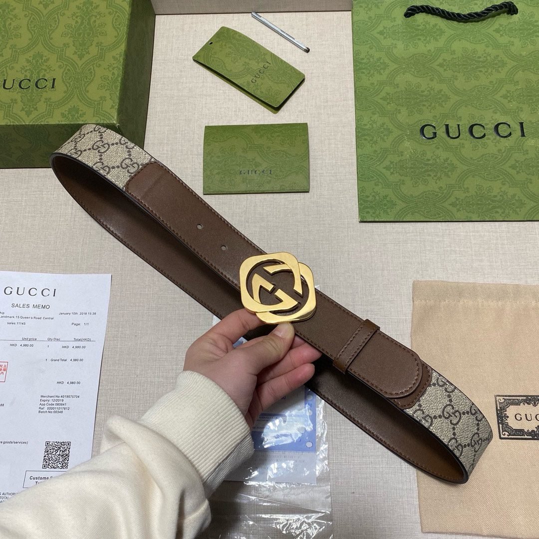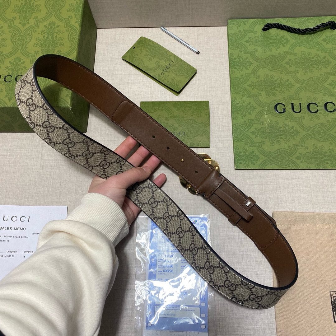 The Gucci brown and beige belt is made of high-quality leather, which is soft and elastic to ensure wearing comfort. The belt design is simple yet elegant, and the interweaving of brown and beige shows a low-key sense of luxury. The gold buckle on the belt is the brand’s signature design, highlighting Gucci’s exquisite craftsmanship and superior quality.