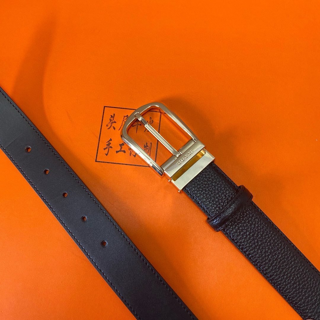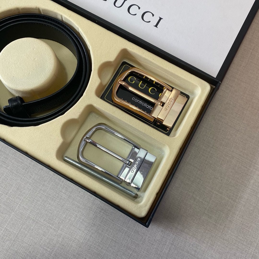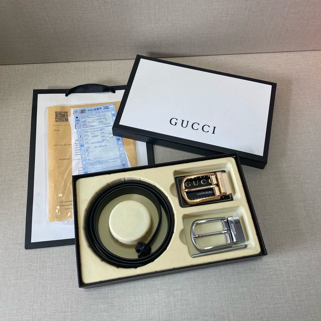 Home Belt GUCCI Belt Gucci classic black leather gold silver double buckle belt simple and elegant with fine texture