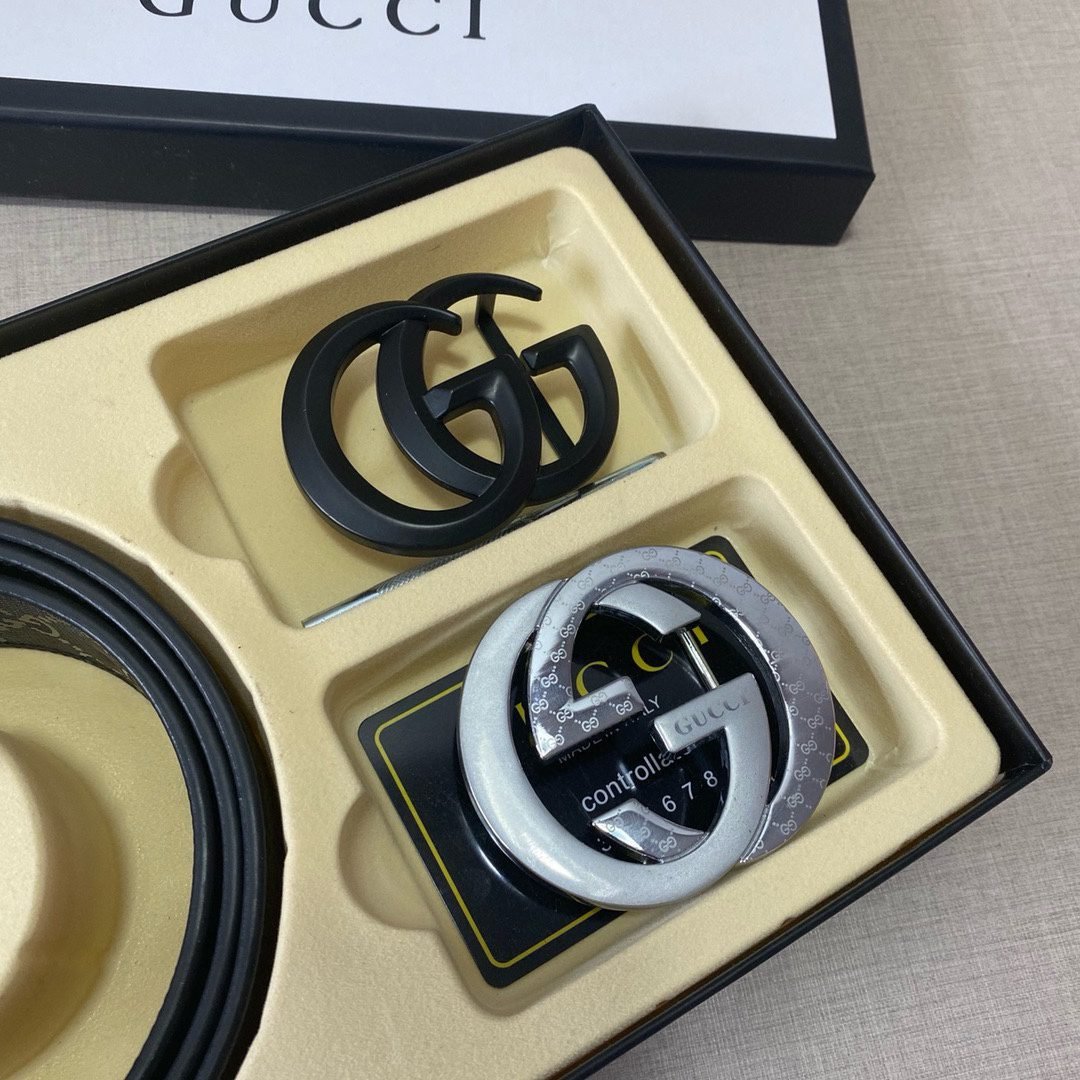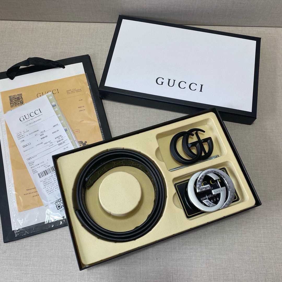 Gucci two-button gift box set combines elegance and luxury. Selected from the finest black leather, it feels delicate and elastic, presenting an unparalleled texture. Pair it with a metal buckle to show your dignity and taste, making you stand out from the crowd. The suit also contains two buckles of different sizes, which can be freely adjusted according to the waistline to meet the dressing needs of different occasions.