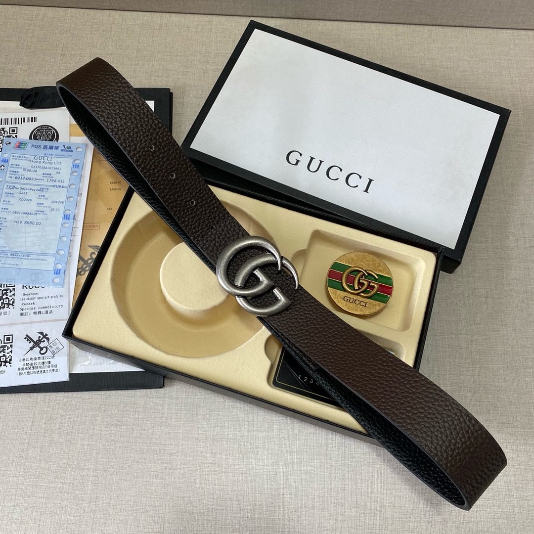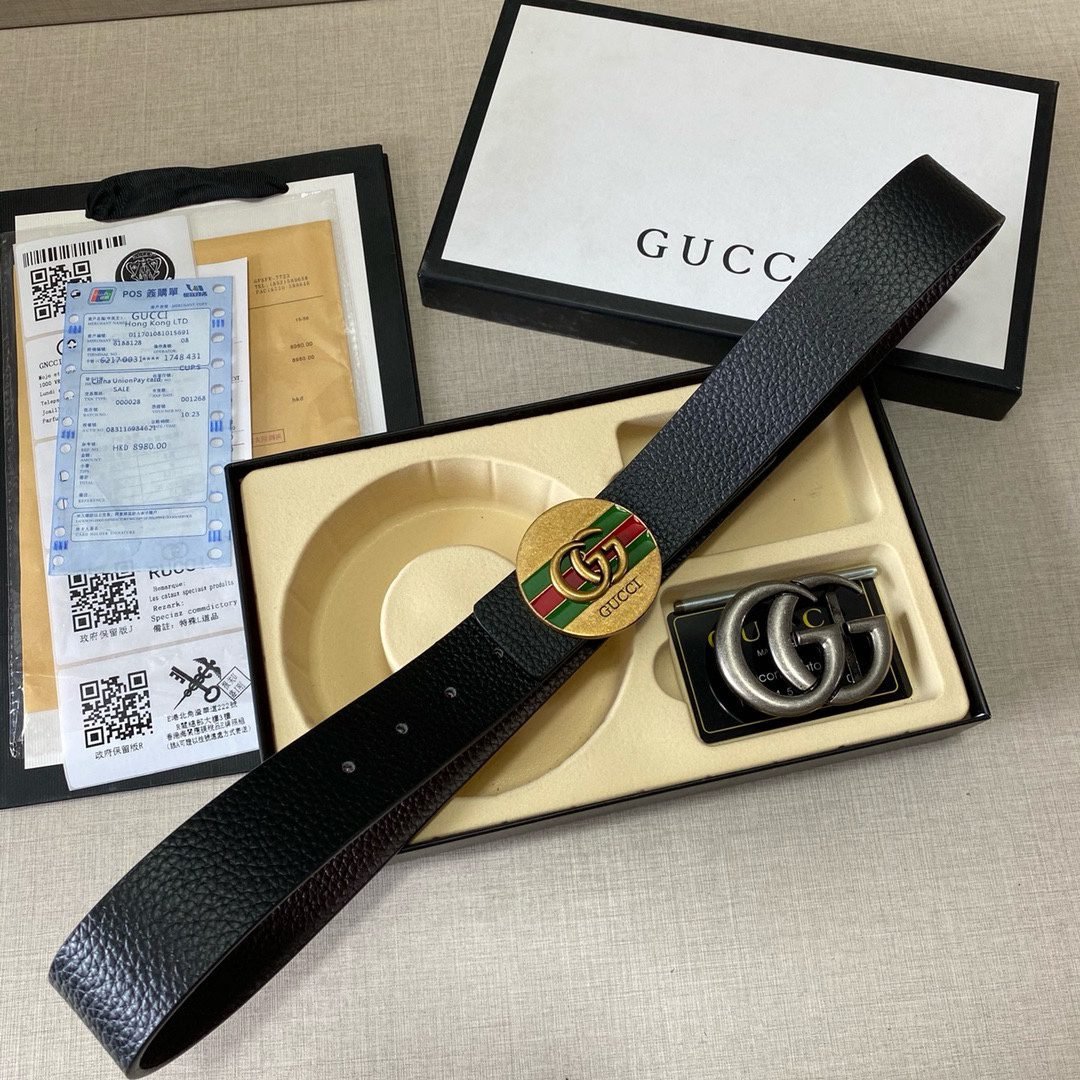This Gucci double G buckle gift box set, with its unique design and exquisite craftsmanship, demonstrates the brand’s unparalleled fashion taste and craftsmanship. The black leather belt is classic and timeless, showing a low-key sense of luxury. In addition, the gift box is equipped with two buckles. The green and red stripes on the gold buckle inject a touch of vitality, and the silver double G buckle makes the overall design more fashionable and dynamic. The belt is made of high-quality leather material, which is soft and delicate to the touch and durable, ensuring your comfortable experience of wearing it for a long time.