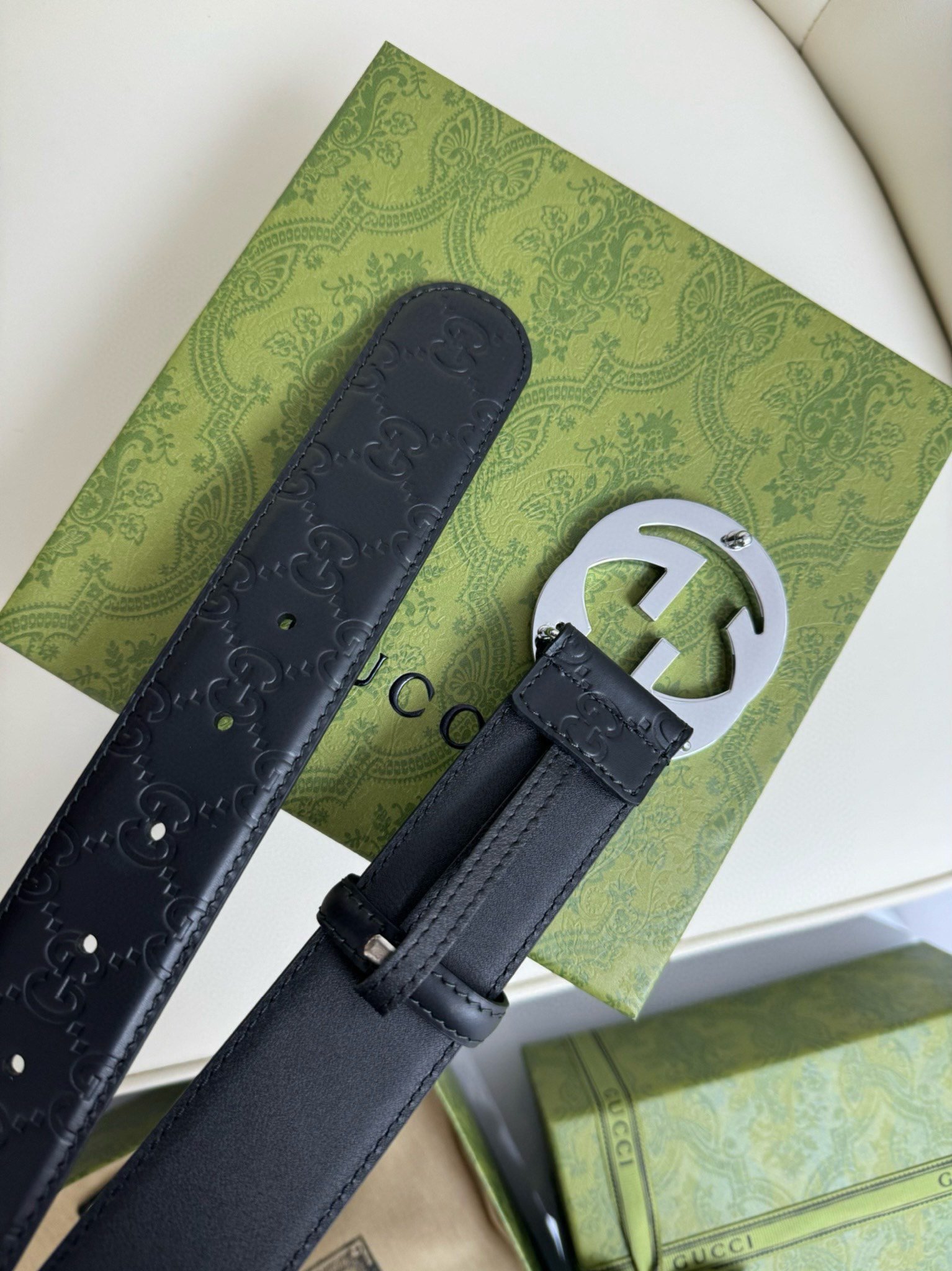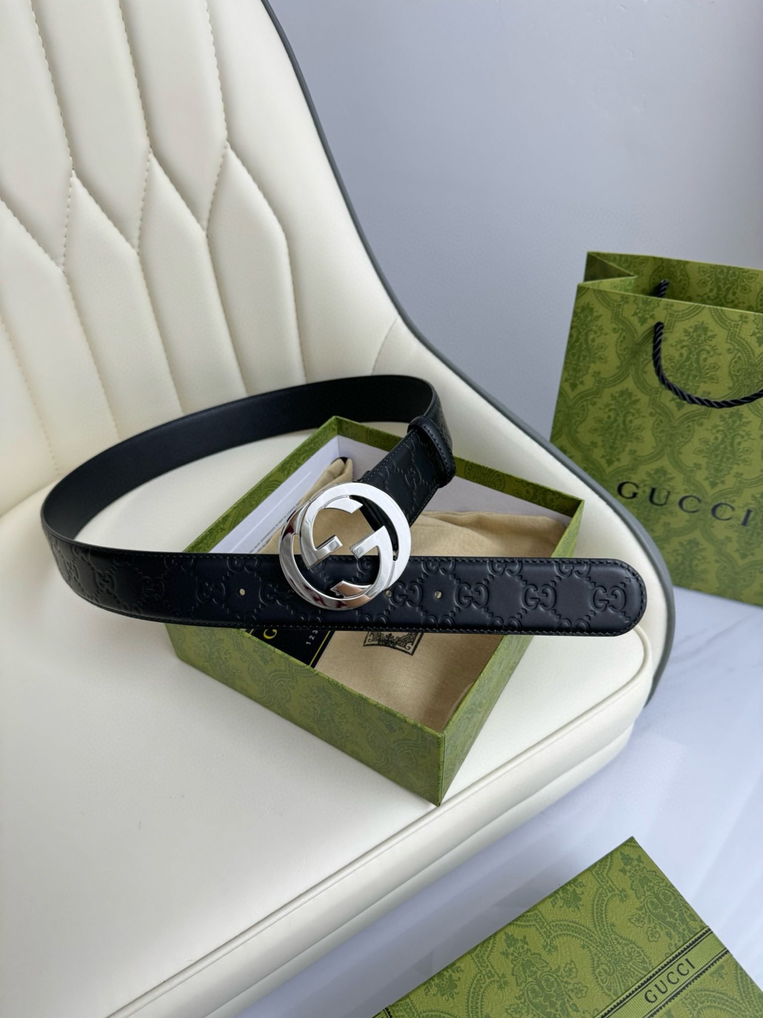This Gucci luxury silver G buckle black belt perfectly combines classic and modern. The belt buckle head is centered on the silver G logo, showing the nobility and uniqueness of the Gucci brand. The black leather is carefully selected and processed, with excellent wear resistance and softness, allowing the wearer to experience the ultimate comfort. Every detail is processed with exquisite craftsmanship to ensure the perfect presentation of the product.