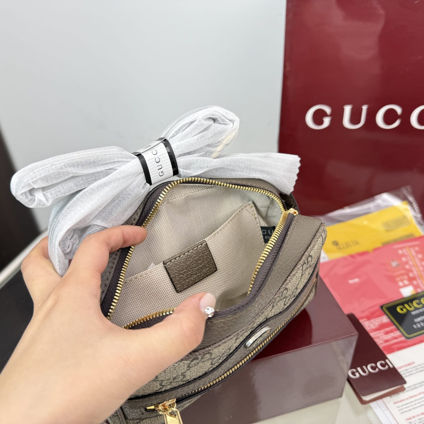 This GUCCI Ophidia mini crossbody bag showcases the brand’s iconic GG monogram print, complemented by the signature green-red-green Web stripe and polished gold-tone hardware, with a compact size of 18cm. Embodying GUCCI’s heritage of luxury and retro-inspired design, it features an adjustable crossbody strap for versatile wear. Perfect for those who appreciate iconic branding, timeless details, and petite elegance, this bag makes a sophisticated statement suitable for daily outings or as a chic accessory.