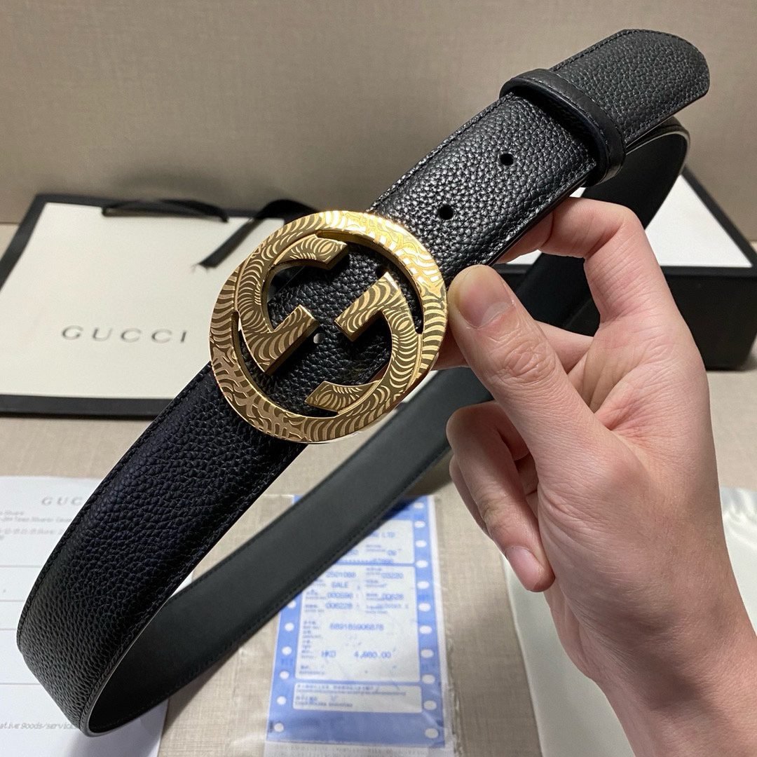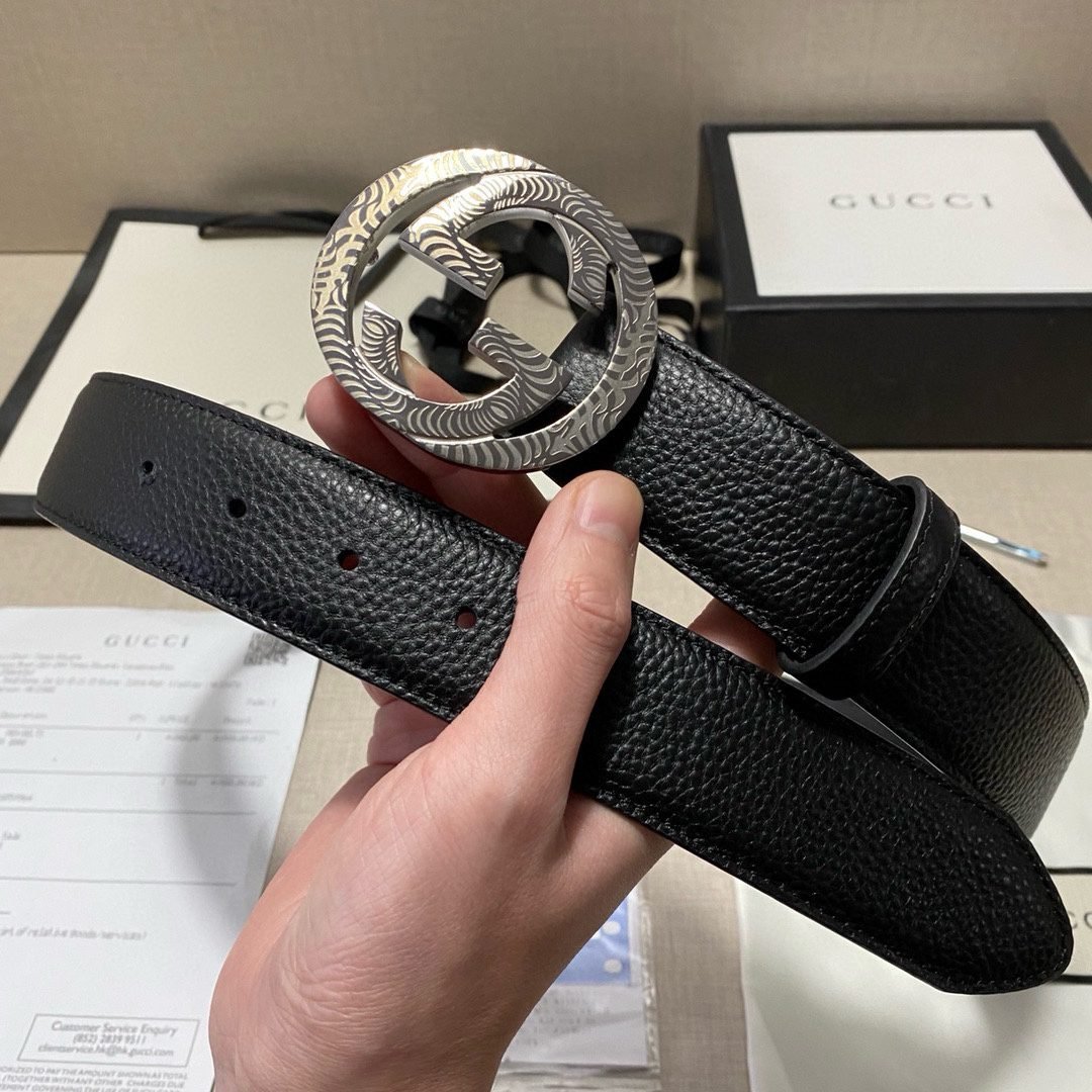 This Gucci textured double-G buckle black belt combines the brand’s consistent elegance and luxury. The belt is made of top-grade leather material, with a natural and delicate texture, soft and elastic feel. The surface of the belt has been specially treated to give it a unique black luster. Showing nobility and elegance, the belt buckle is made of high-quality metal, and the gold and black are perfectly matched, showing the brand’s charm.