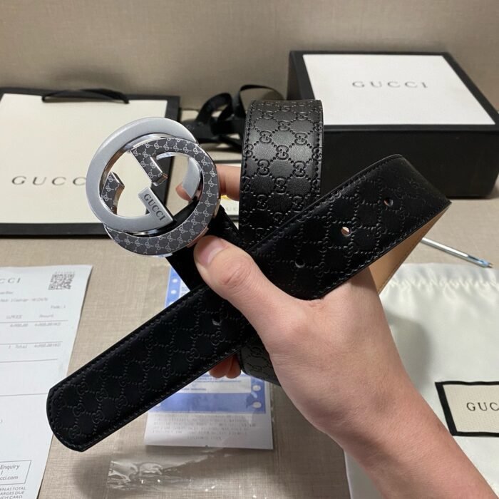 This Gucci two-color double G buckle black textured belt has become a classic in the fashion industry with its unique design and excellent quality. It is made of high-quality black leather material, and the surface has been finely polished, showing a charming luster and delicate touch. The belt buckle is inlaid with the iconic double G pattern, highlighting the brand’s nobility and elegance.