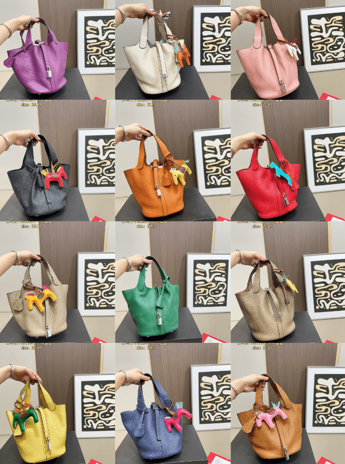 This Hermès Picotin Lock bag collection is crafted from luxurious calfskin leather, featuring the brand’s iconic silhouette of 20×19cm and polished hardware. Embodying Hermès’ legacy of exceptional craftsmanship and timeless elegance, each bag is complemented by playful accessories like colorful horse charms, adding a whimsical yet sophisticated touch. Available in a spectrum of refined hues, this bag seamlessly merges practical functionality with iconic design, making it perfect for those who appreciate premium materials, meticulous artistry, and versatile luxury in daily wear or special occasions.