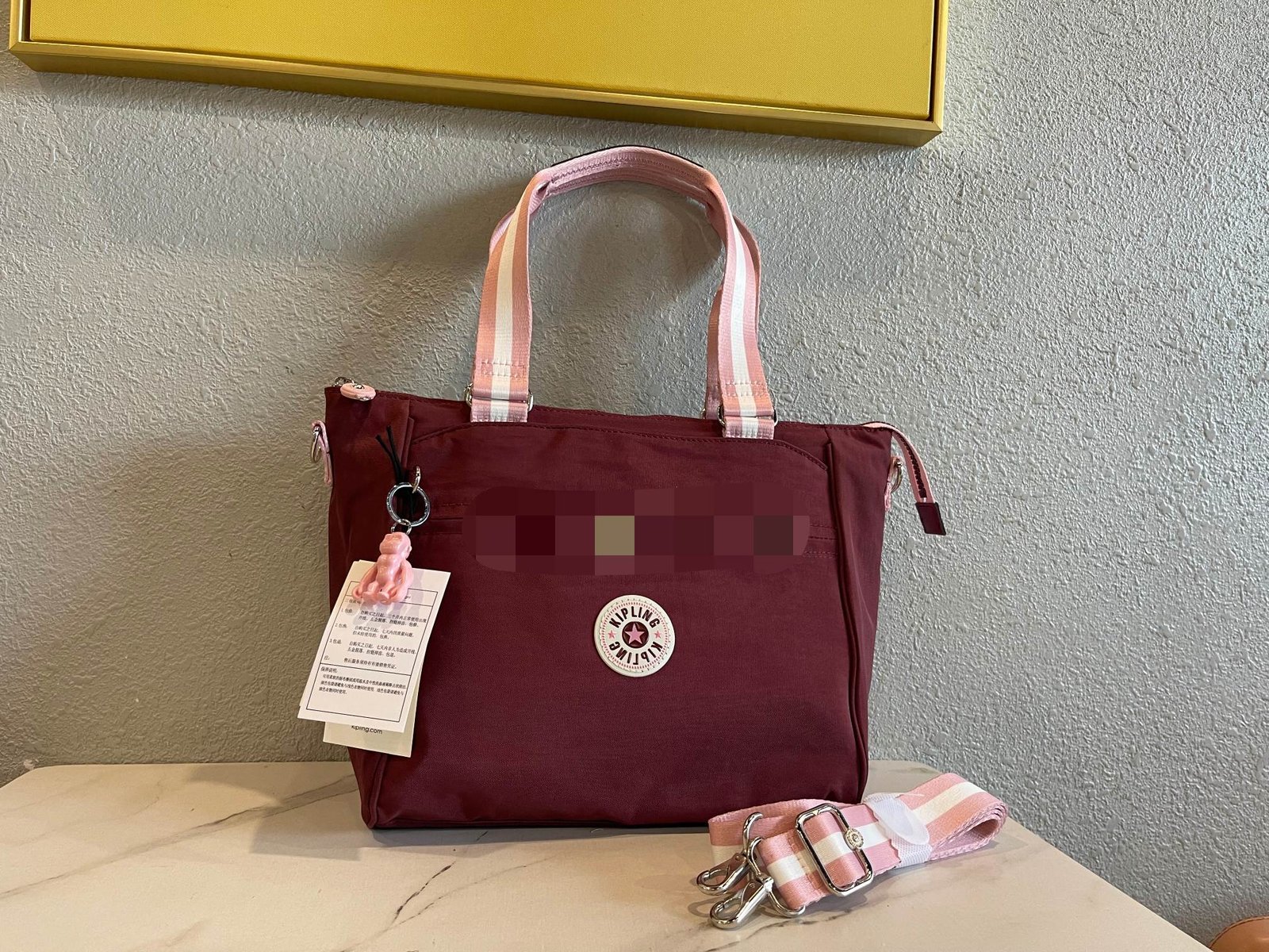 In addition, there is a small piece of paper with a white label next to the handbag, on which the relevant information of the product is printed, making it convenient for you to learn more details about the product. The entire handbag is placed on a light colored tabletop with a simple gray wall background, highlighting the elegance and grandeur of the handbag.