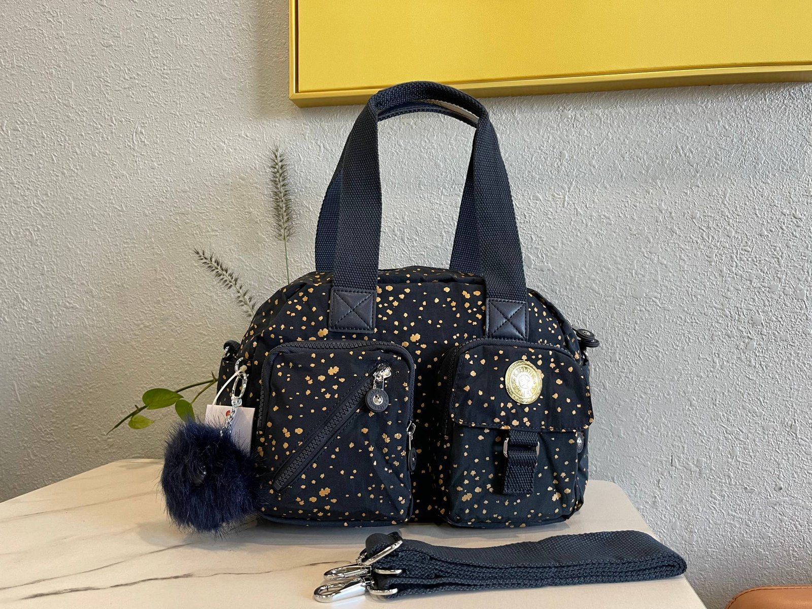 This black KIPLING gold spotted handbag has become a new favorite in the fashion industry with its unique design and high-quality materials. The handbag is predominantly black in color, paired with gold speckled patterns, showcasing a low-key yet luxurious aesthetic. The scattered patterns of spots add a sense of fun and layering to the entire bag.