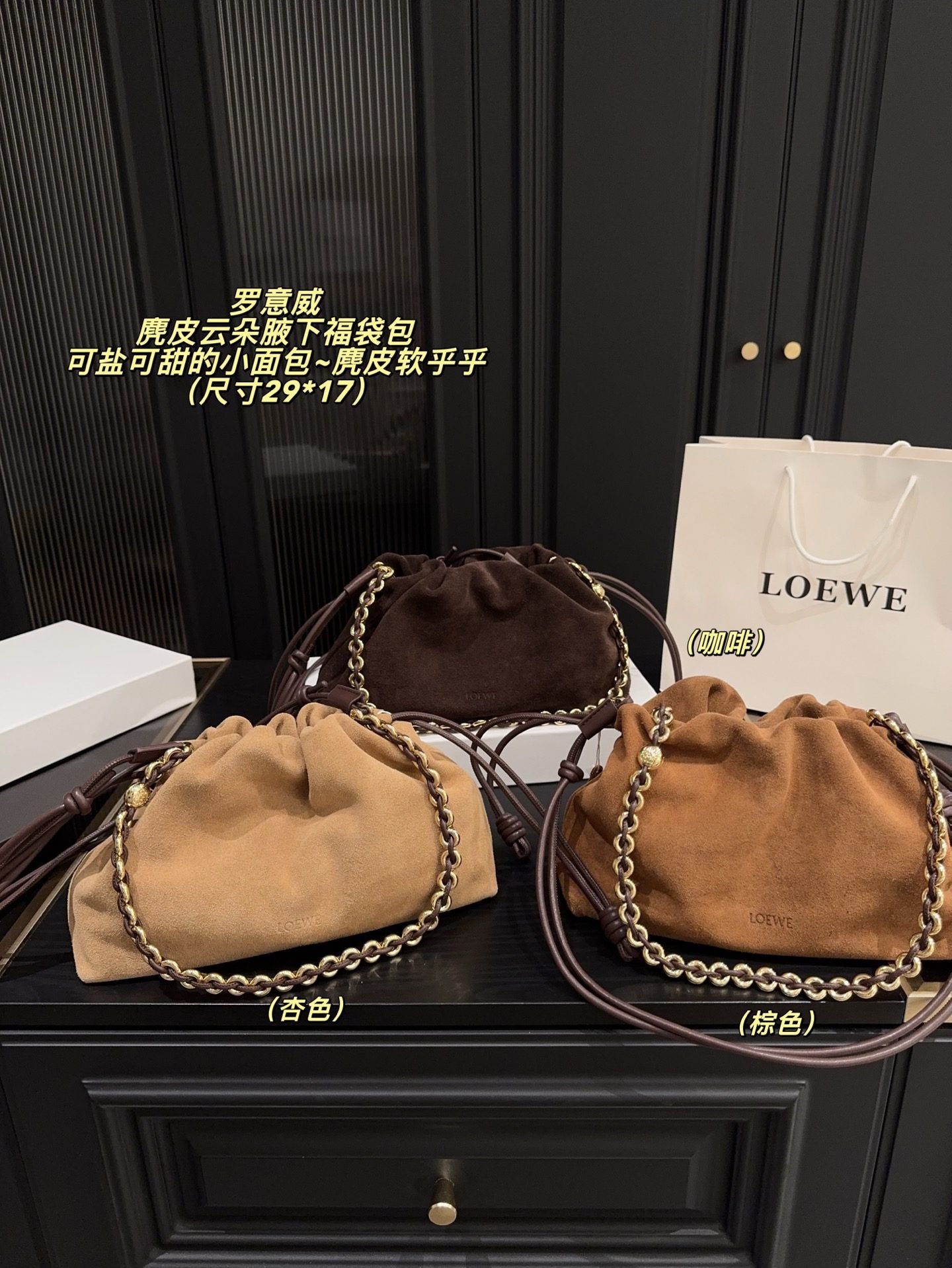 Loewe suede cloud pouch bags embody soft sophistication, featuring plush suede craftsmanship, eye-catching gold chain detailing, and a range of elegant neutral hues like apricot, coffee, and brown. With Loewe’s legacy of meticulous design and textural artistry, these bags blend cloud-like softness with chic functionality. Perfect for those who appreciate a fusion of tactile luxury and versatile style, they make a refined statement suitable for both casual daytime looks and upscale evening ensembles.