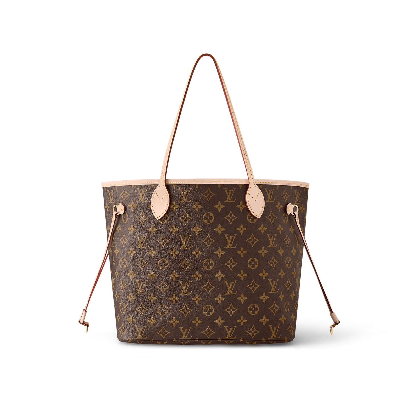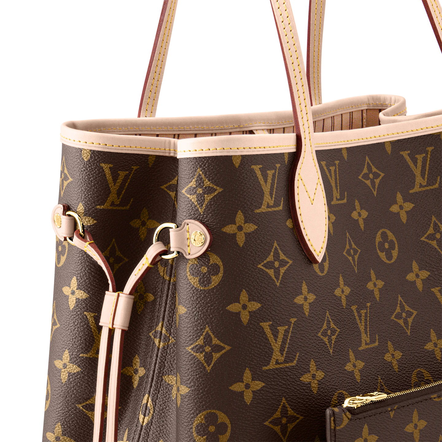 The Neverfull MM tote unites timeless design with heritage details. Made from supple Monogram canvas with natural cowhide trim. it is roomy yet not bulky. with side laces that cinch for a sleek allure or loosen for a casual look. Slim. comfortable handles slip easily over the shoulder or arm. Lined in colorful textile. it features a removable pouch which can be used as a clutch or an extra pocket.