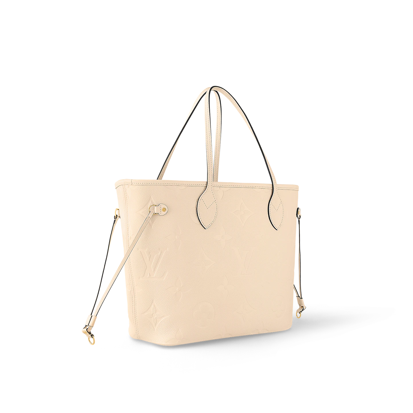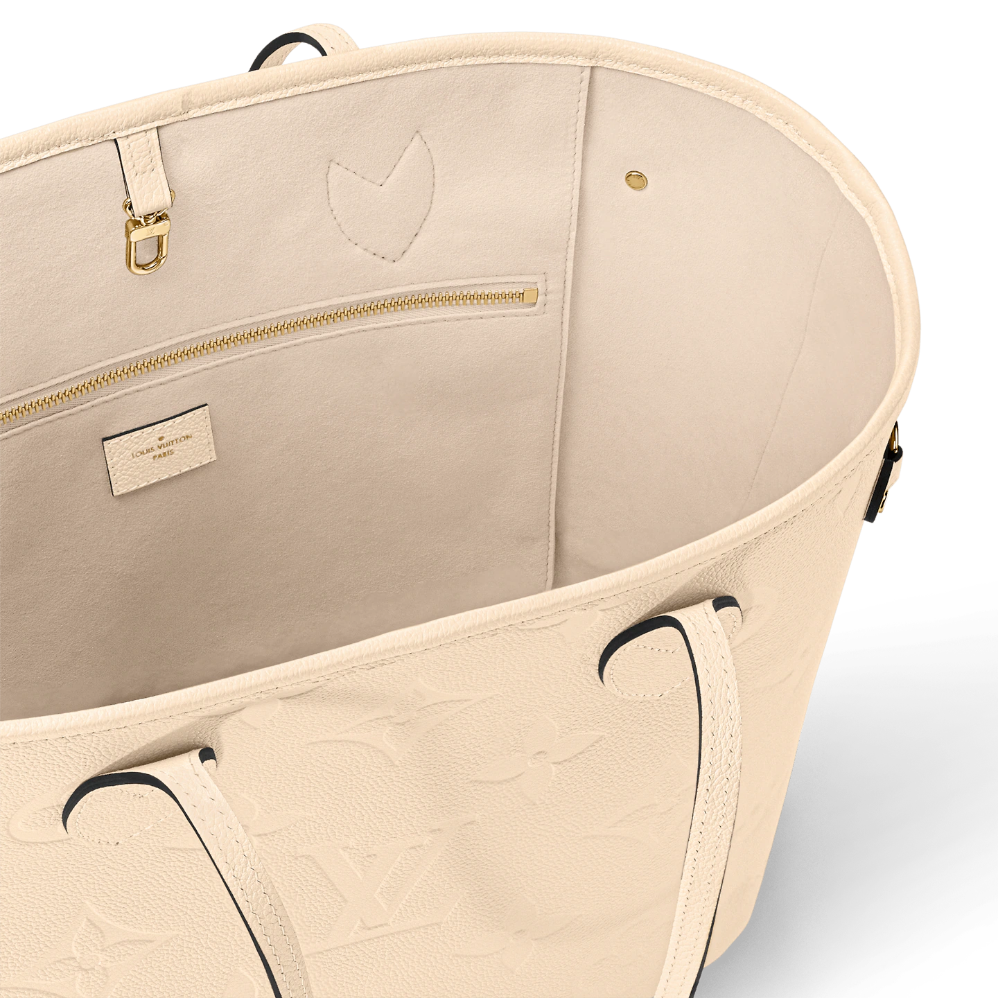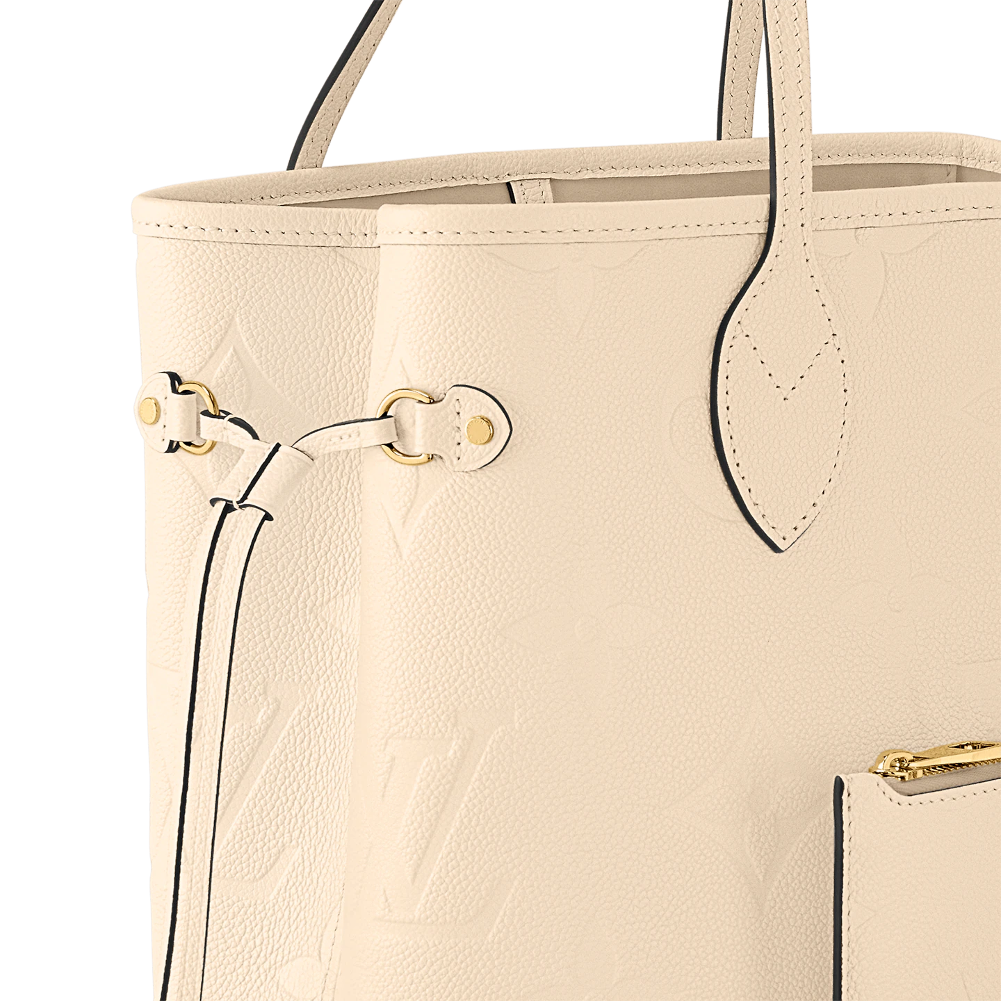 The Neverfull MM tote bag is made from grained Monogram Empreinte leather. with gold-color hardware and a tone-on-tone microfiber lining. A zipped pocket inside can be removed and used separately. The side laces can be tightened for a sleeker look or loosened for more casual use.