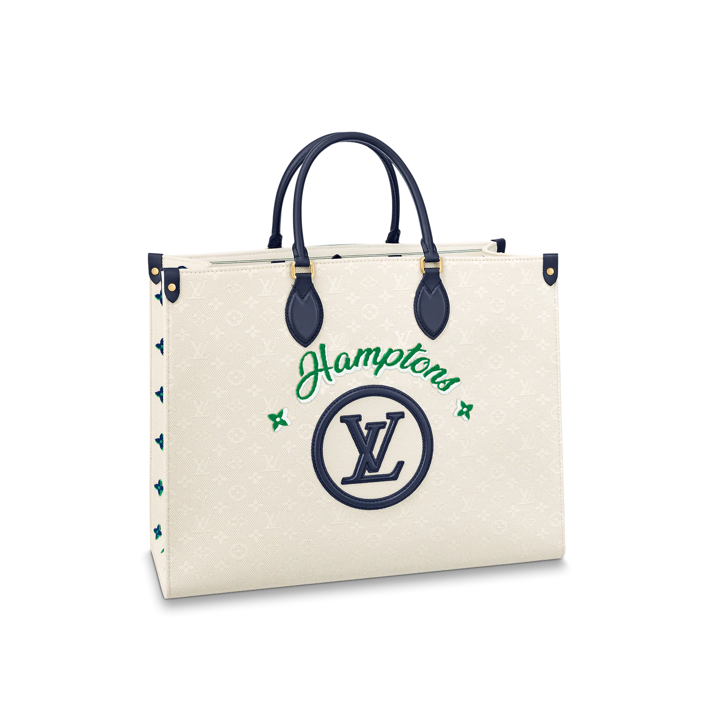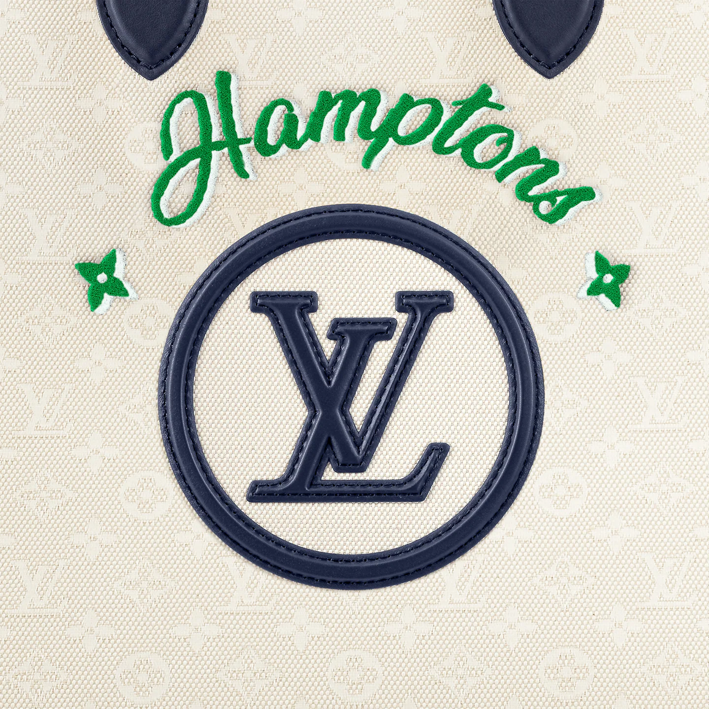 Emblazoned with the name of a favorite holiday destination. this Hamptons edition of the OnTheGo GM tote is the ideal companion for summer getaways. Made from tone-on-tone Monogram jacquard canvas enhanced with colorful tufted embroidery and an LV Circle emblem. it is fitted with contrasting leather handles and long shoulder straps for a range of chic carry styles.