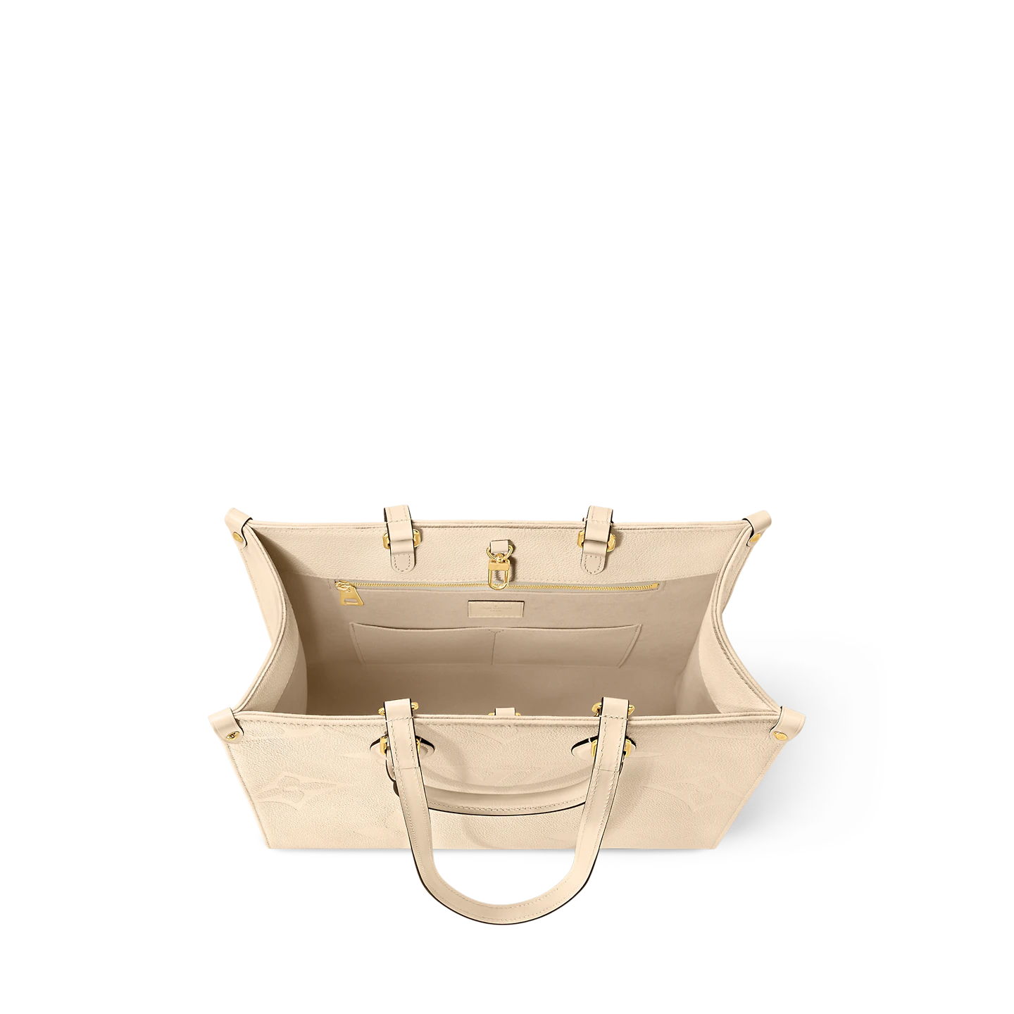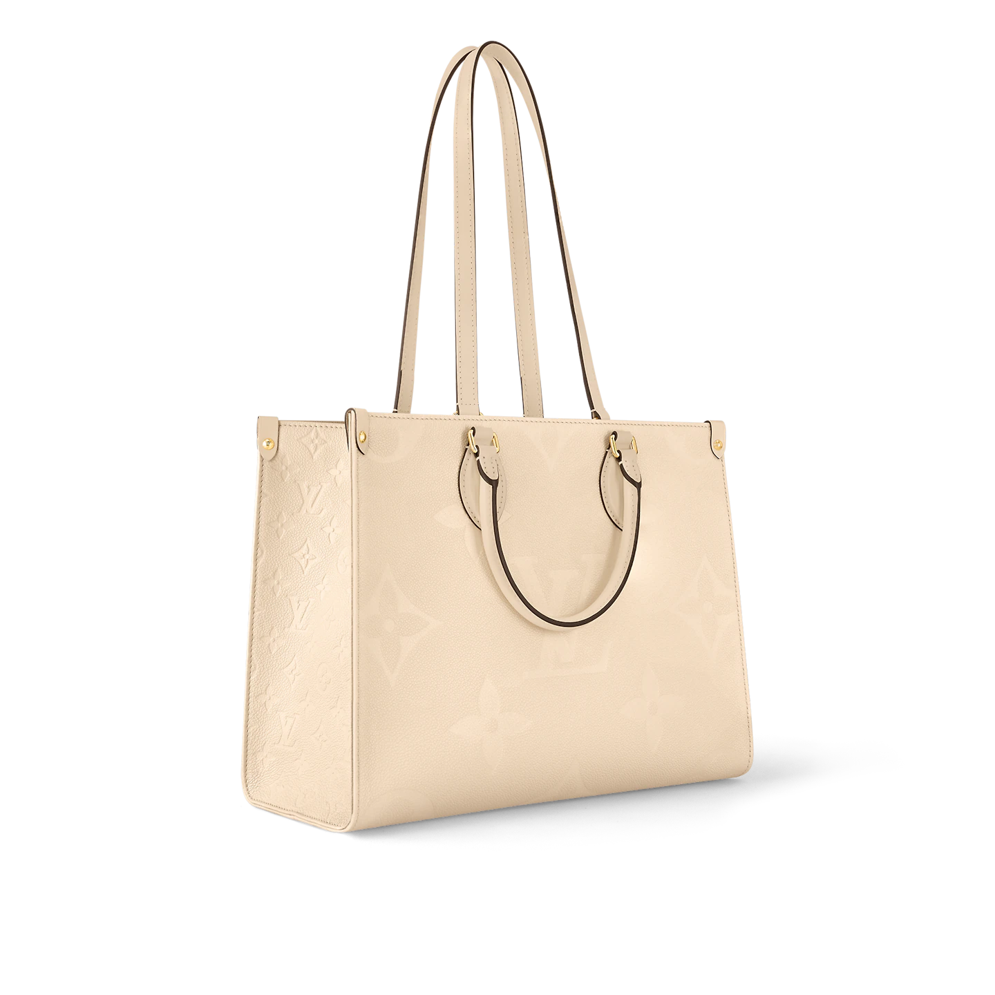 The OnTheGo MM tote now comes in cream-color Monogram Empreinte leather with a matching microfiber lining. The Monogram embossed into the grained leather brings a subtle elegance to the bag’s boxy shape. The roomy interior can easily fit a laptop while rolled-leather top handles and two long shoulder straps give carrying options.