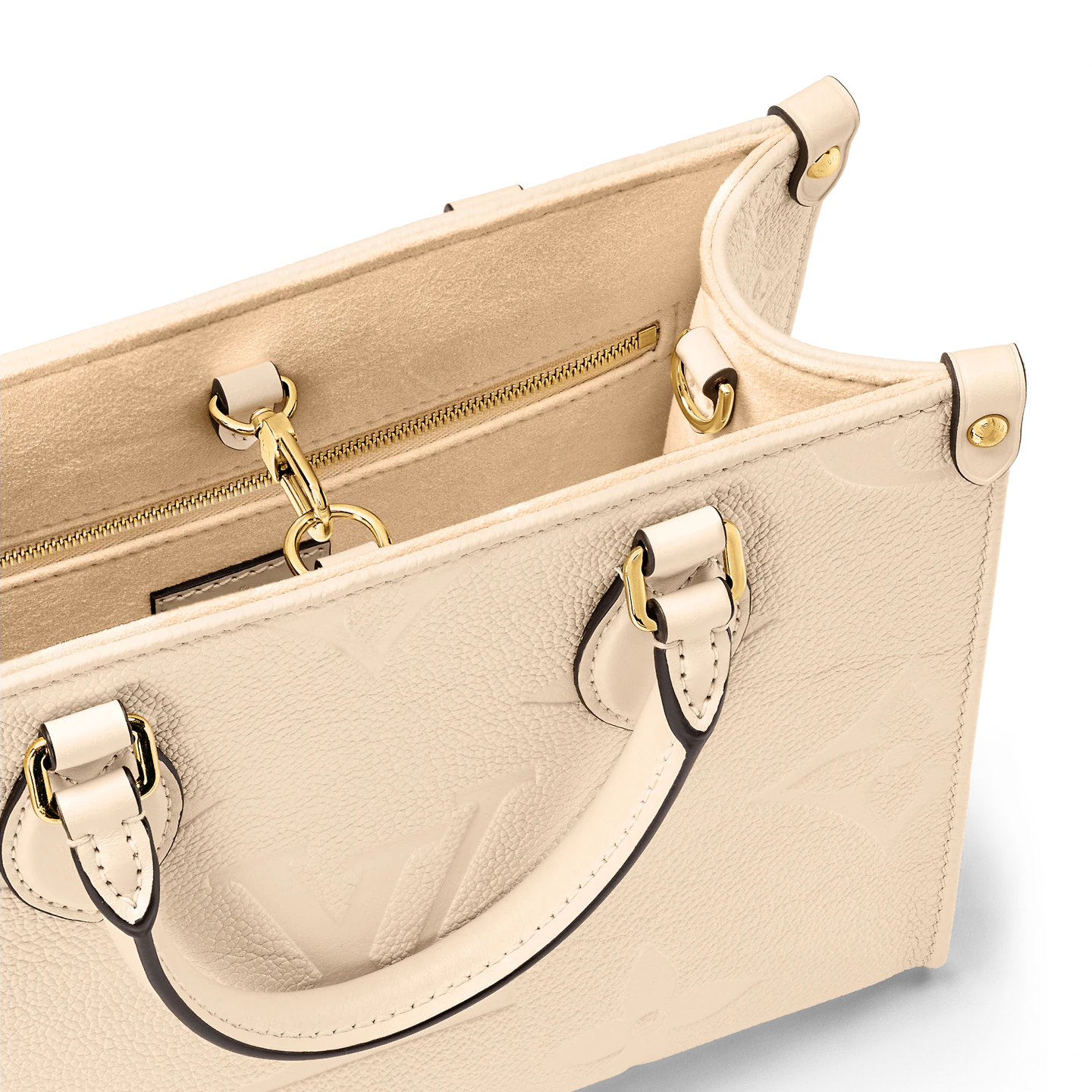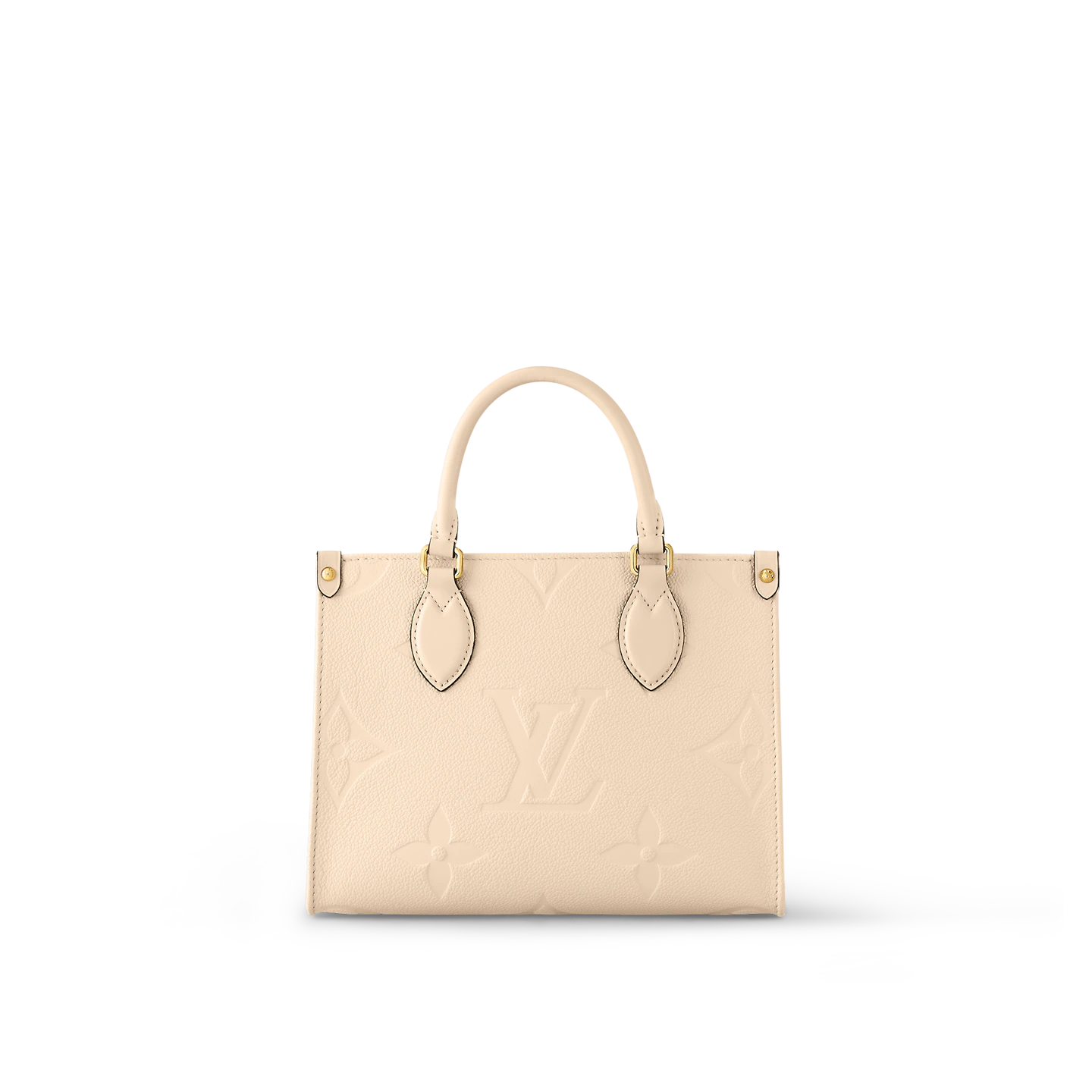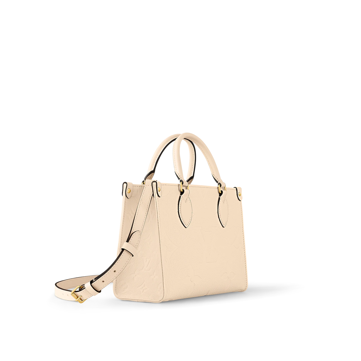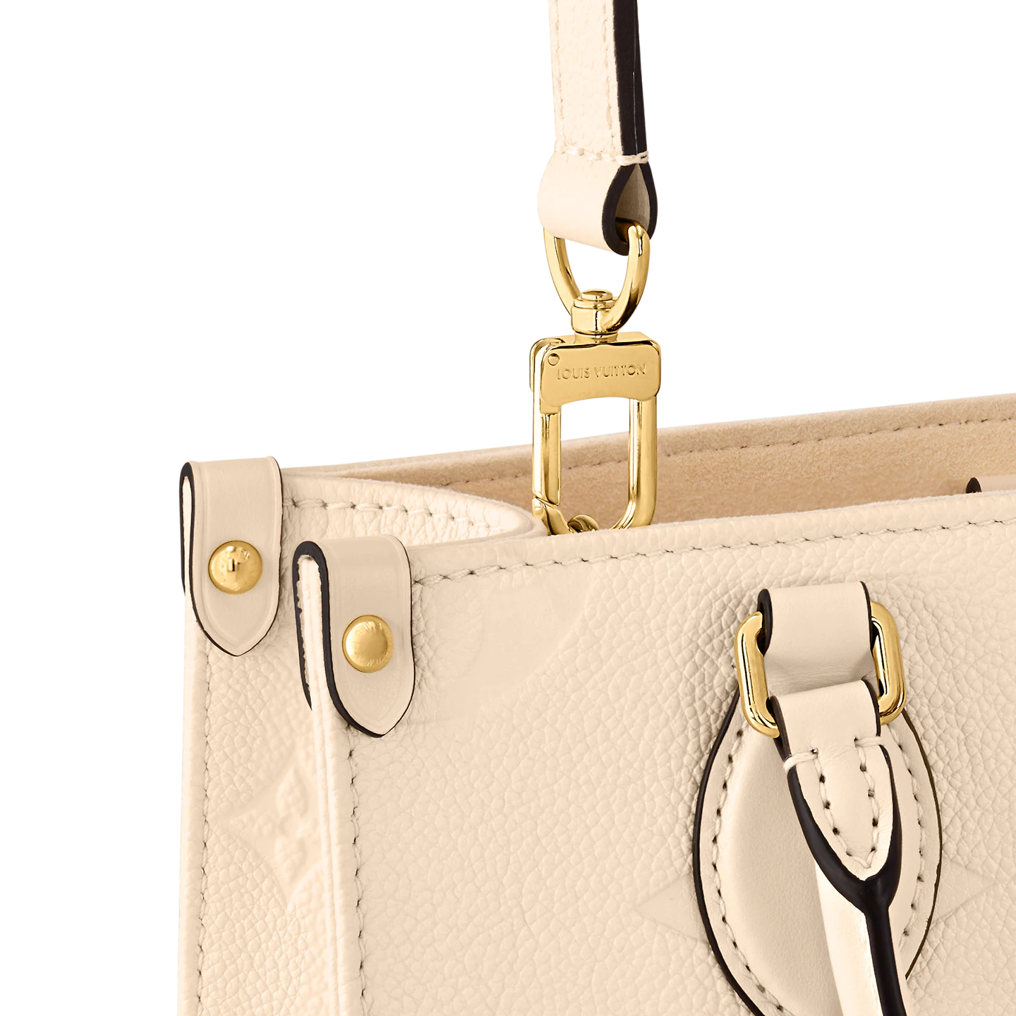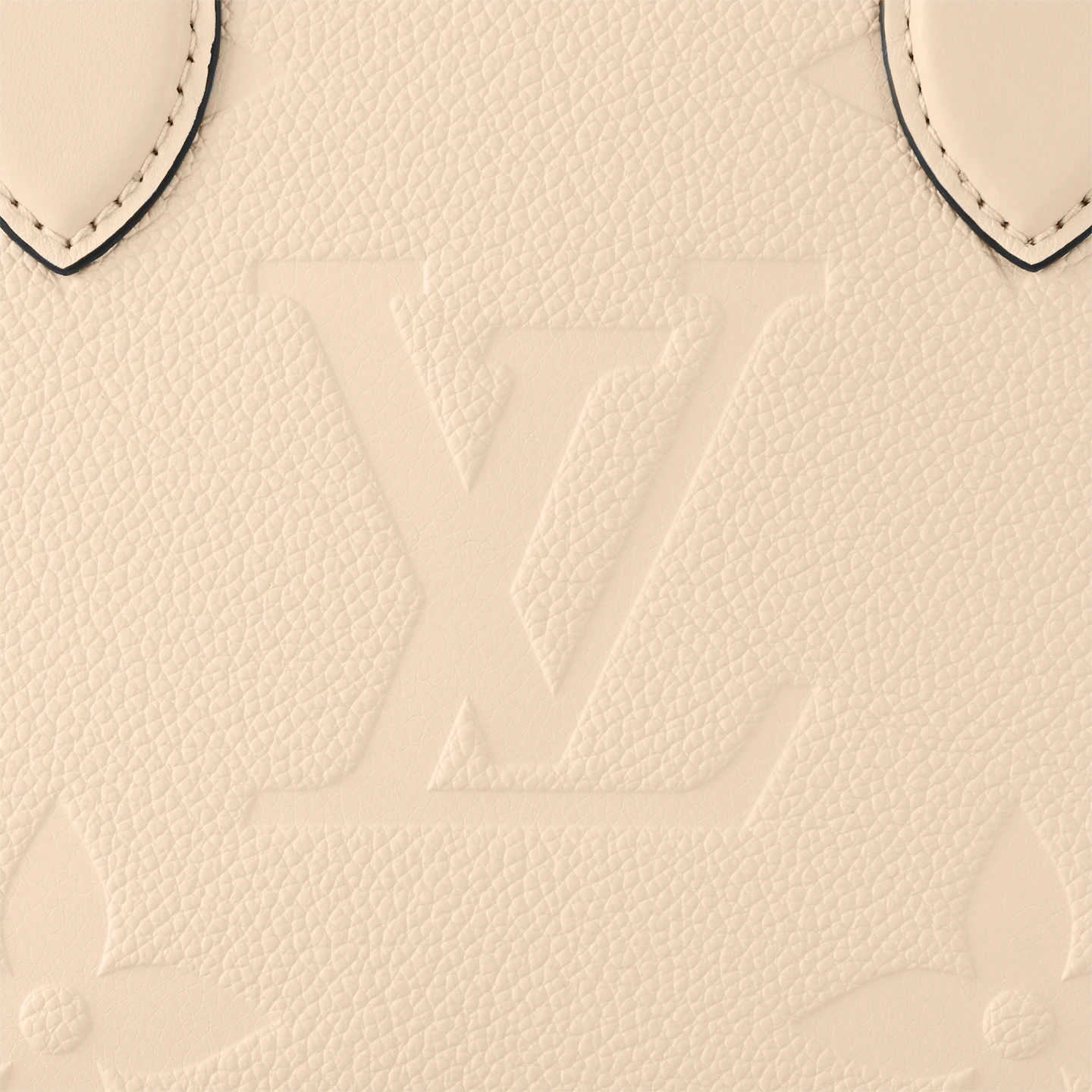 A soft cream-tone makes the Monogram Empreinte leather of this OnTheGo PM bag seem luminous. The LVs and Monogram Flowers embossed into the leather are perfectly complemented by the rectangular lines of this small tote. It can hold smaller essentials like an iPad Mini. Two rolled-leather top handles and a detachable strap give carry options.