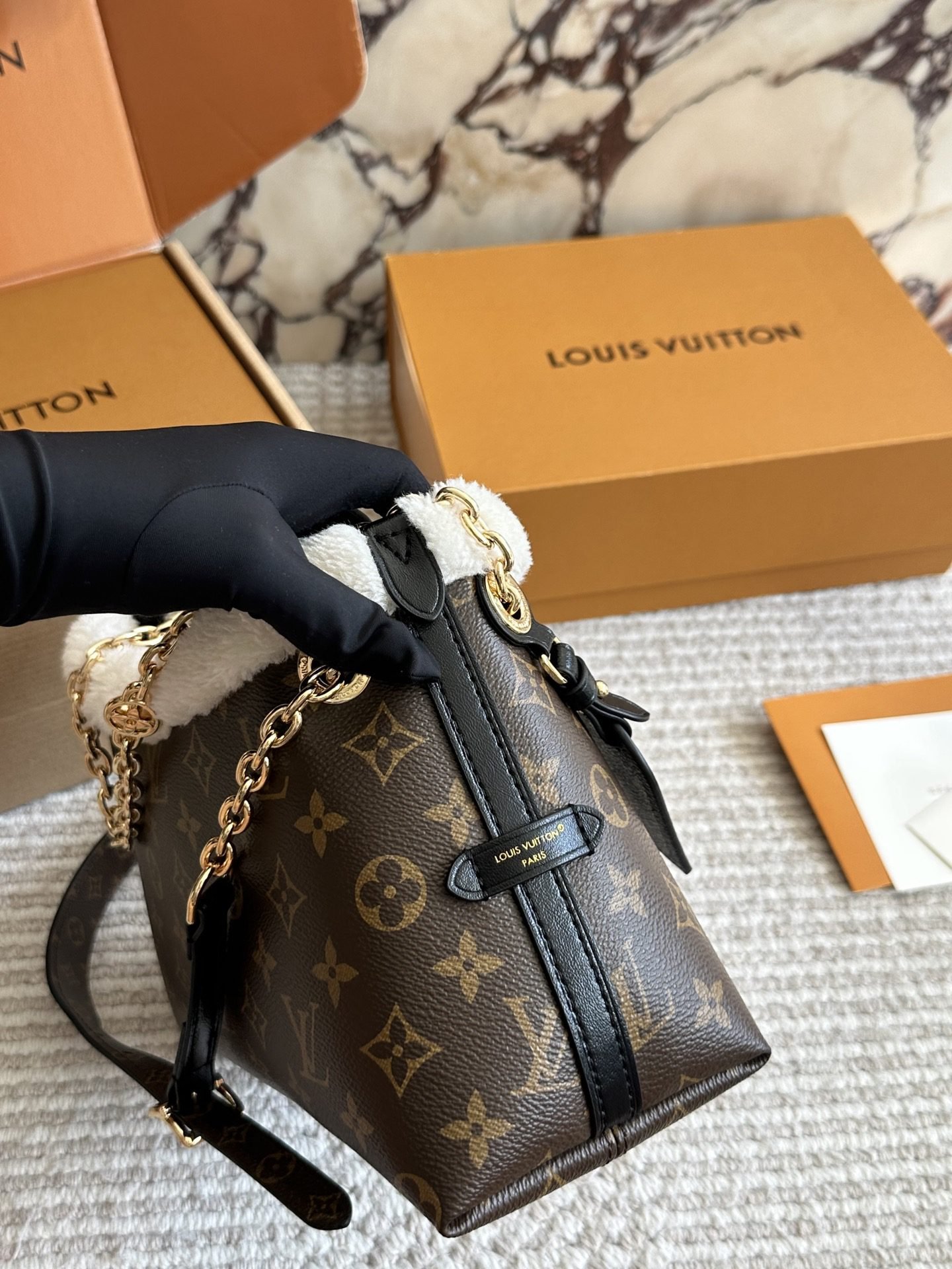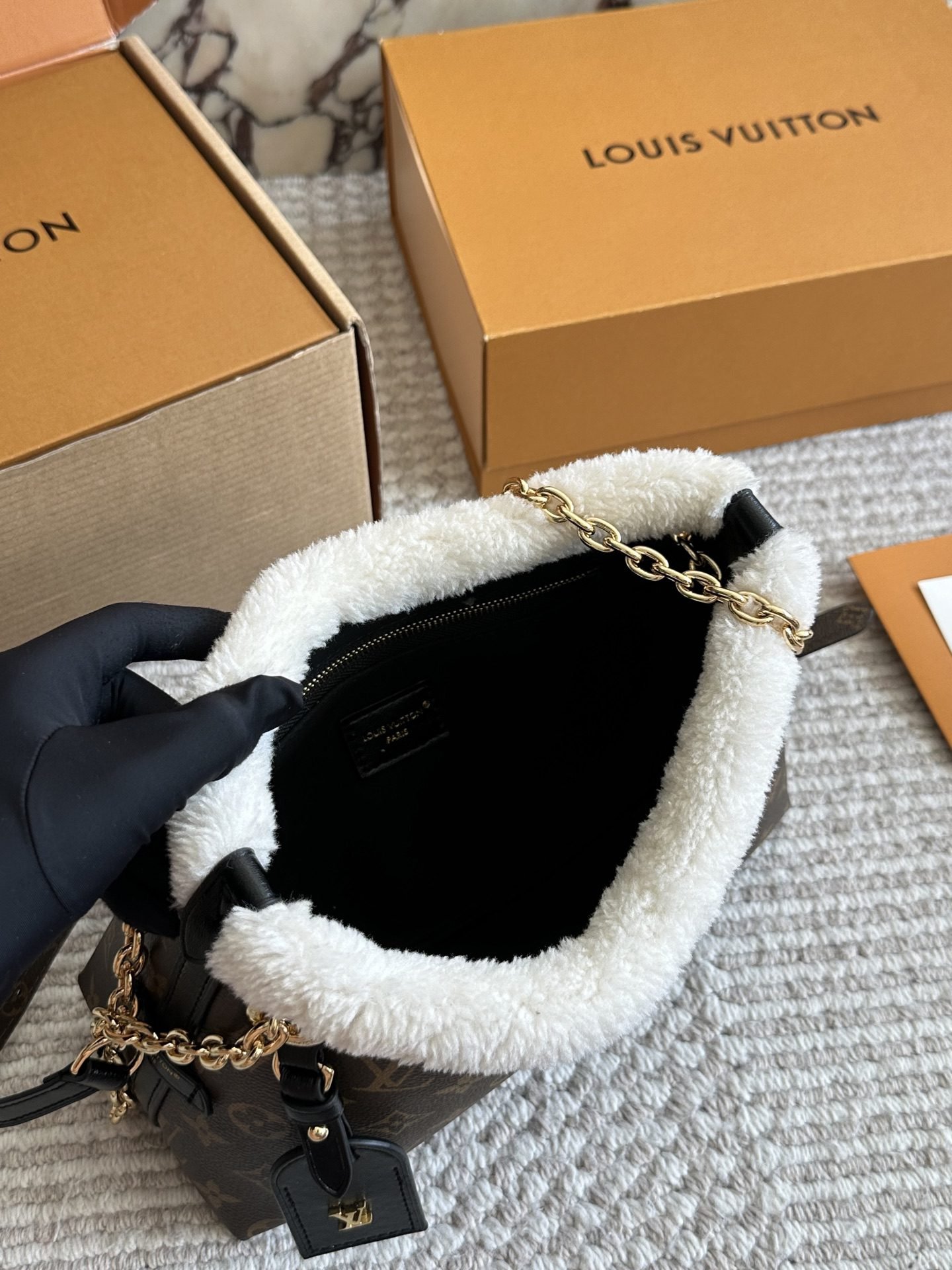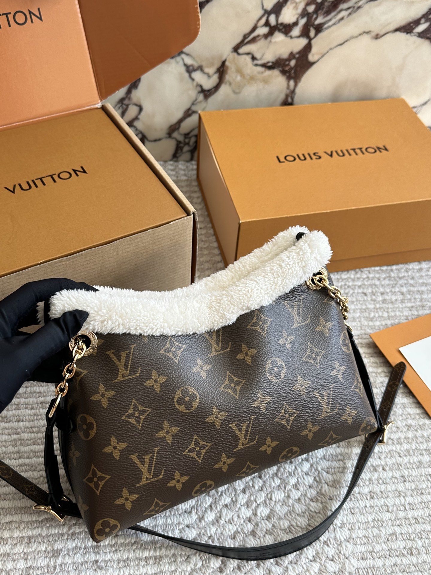 This Louis Vuitton shoulder bag blends classic luxury with cozy charm, featuring the iconic monogram pattern on premium cowhide, a 26cm size, plush shearling trim, and elegant gold chain detailing. With Louis Vuitton’s legacy of exceptional design and material innovation, this bag seamlessly merges timeless branding with seasonal sophistication. Perfect for those who appreciate a fusion of tactile comfort and iconic style, it makes a chic statement suitable for both casual outings and stylish gatherings.