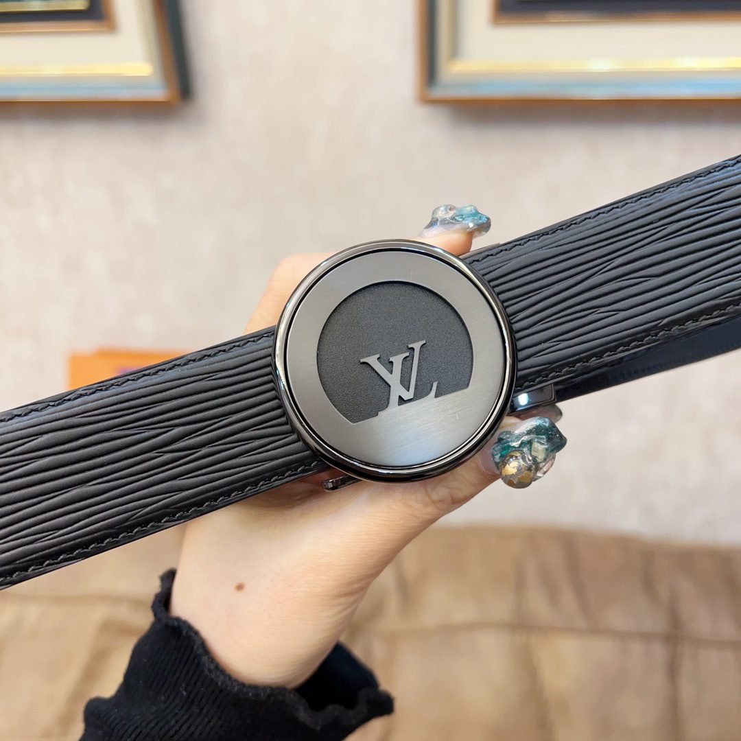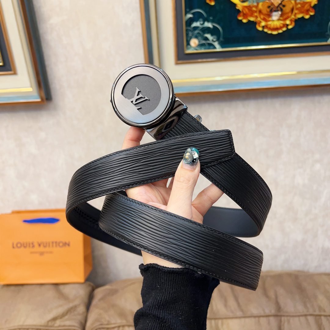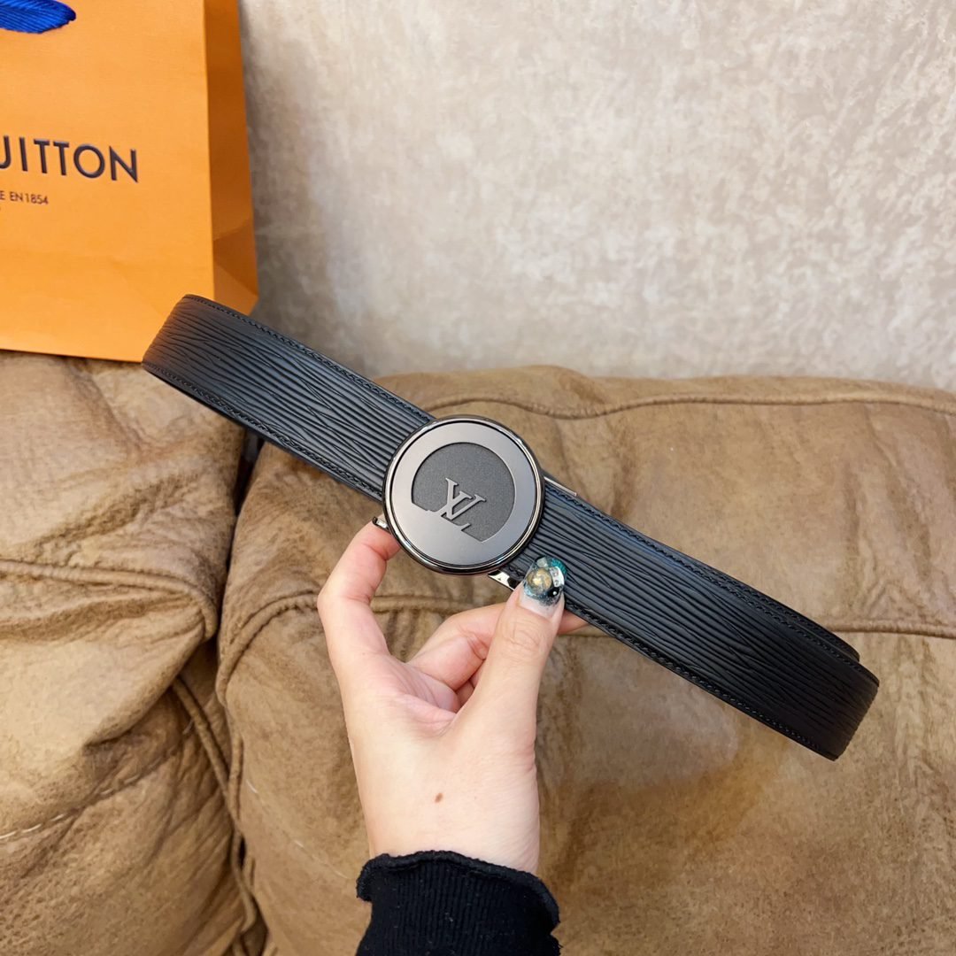 Louis Vuitton’s black belt with silver round buckle, with its exquisite craftsmanship and unique brand charm, demonstrates the noble temperament and taste of men. The belt is made of high-quality black leather, with a delicate and smooth surface and a soft and comfortable touch. The belt buckle is designed in silver and is inlaid with Louis Vuitton’s iconic “LV” pattern, highlighting the brand’s nobility and elegance.