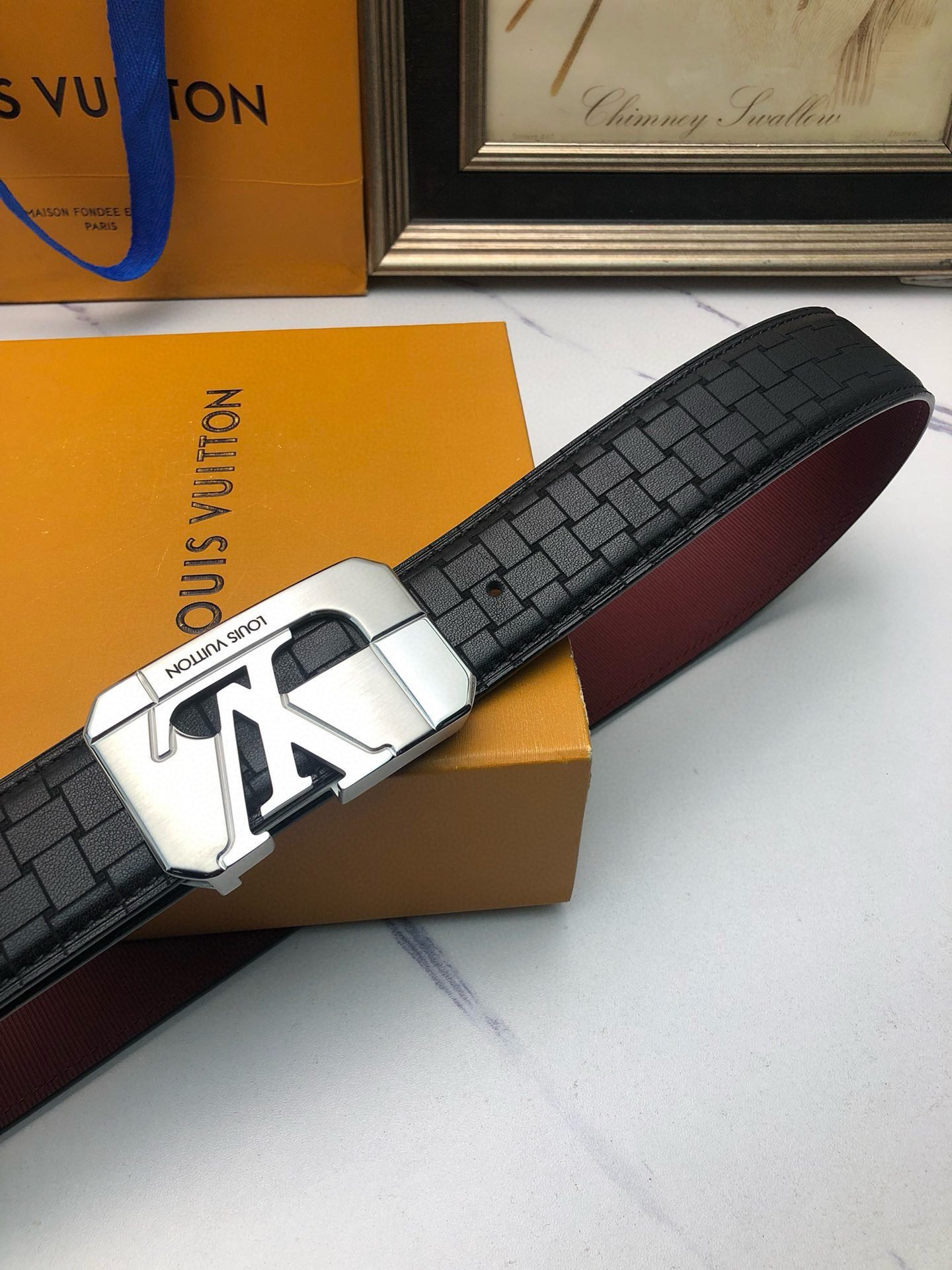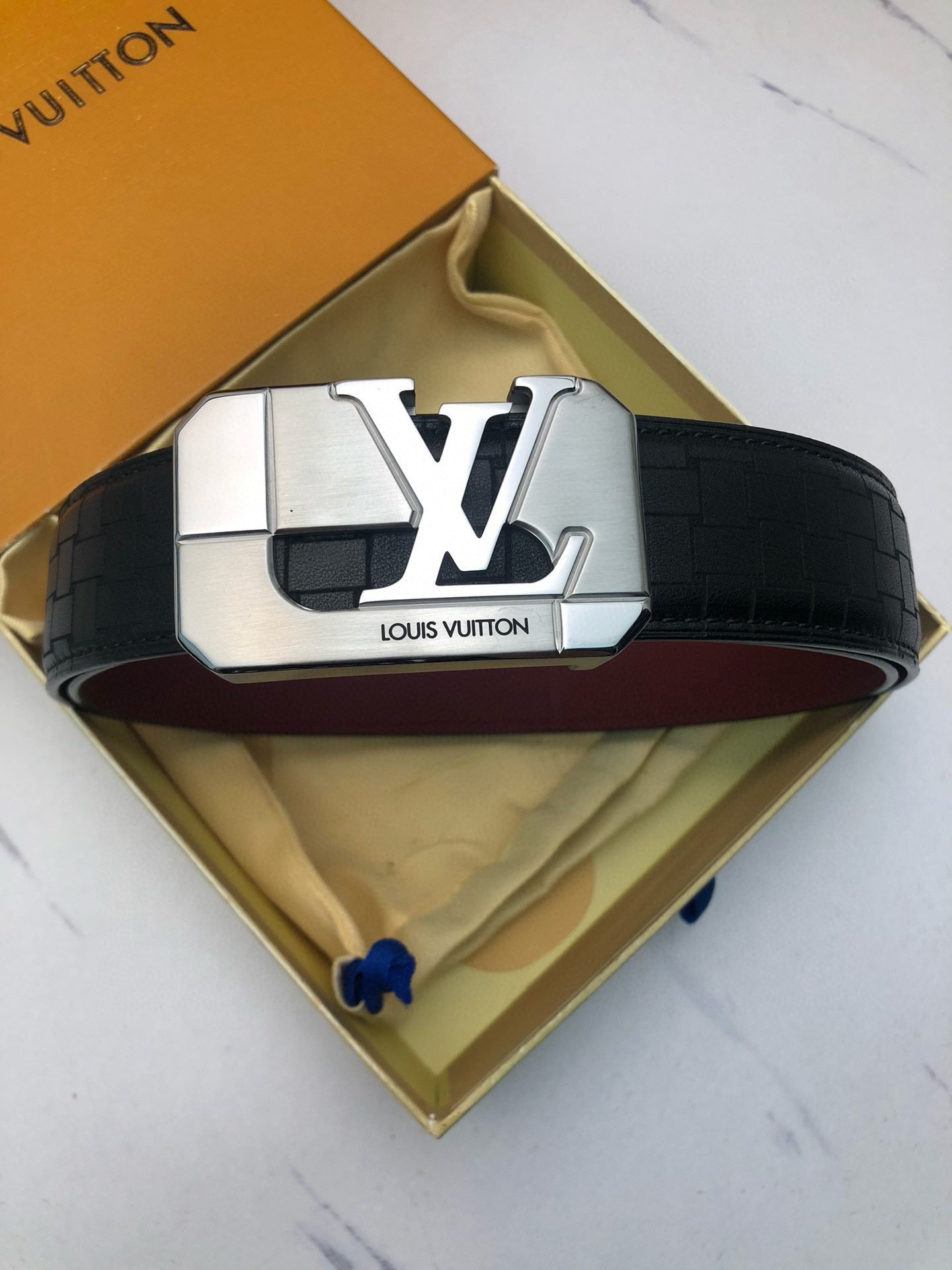 This black belt with a silver square buckle combines classic black and noble silver, intertwining unparalleled fashion and luxury. Selected top-grade leather material, treated with exquisite craftsmanship, soft and elastic to the touch, durable. The belt buckle head is uniquely designed and matched with the classic LV logo, highlighting the wearer’s distinguished status and extraordinary taste.
