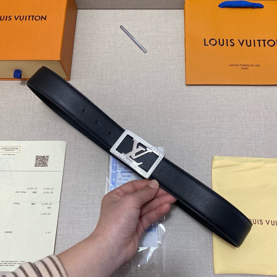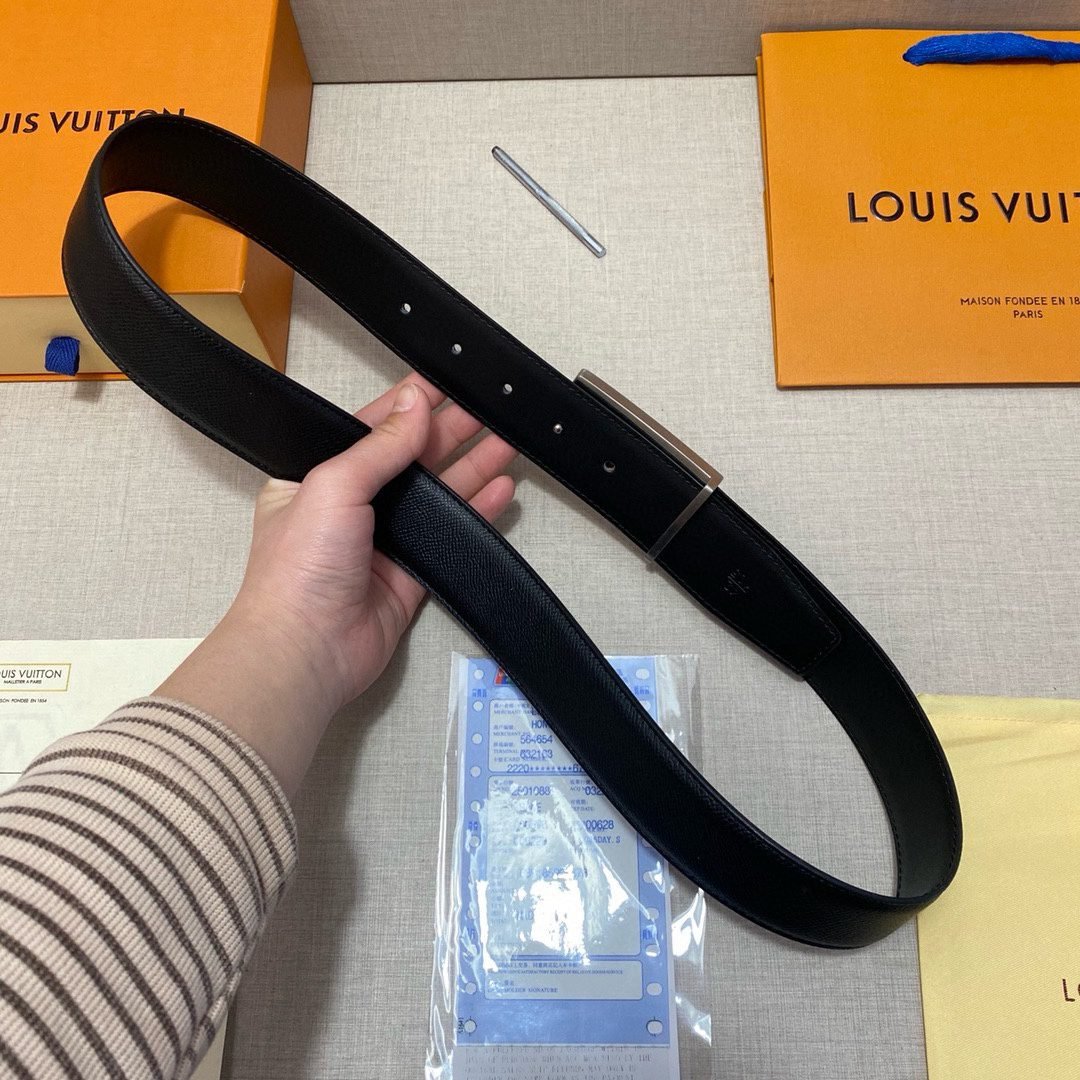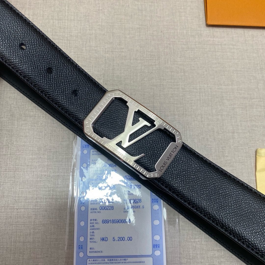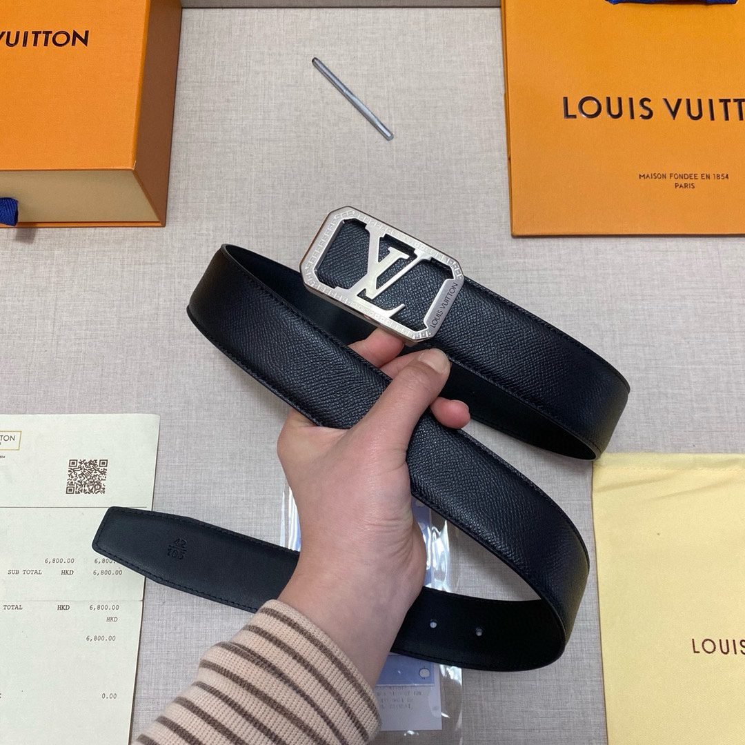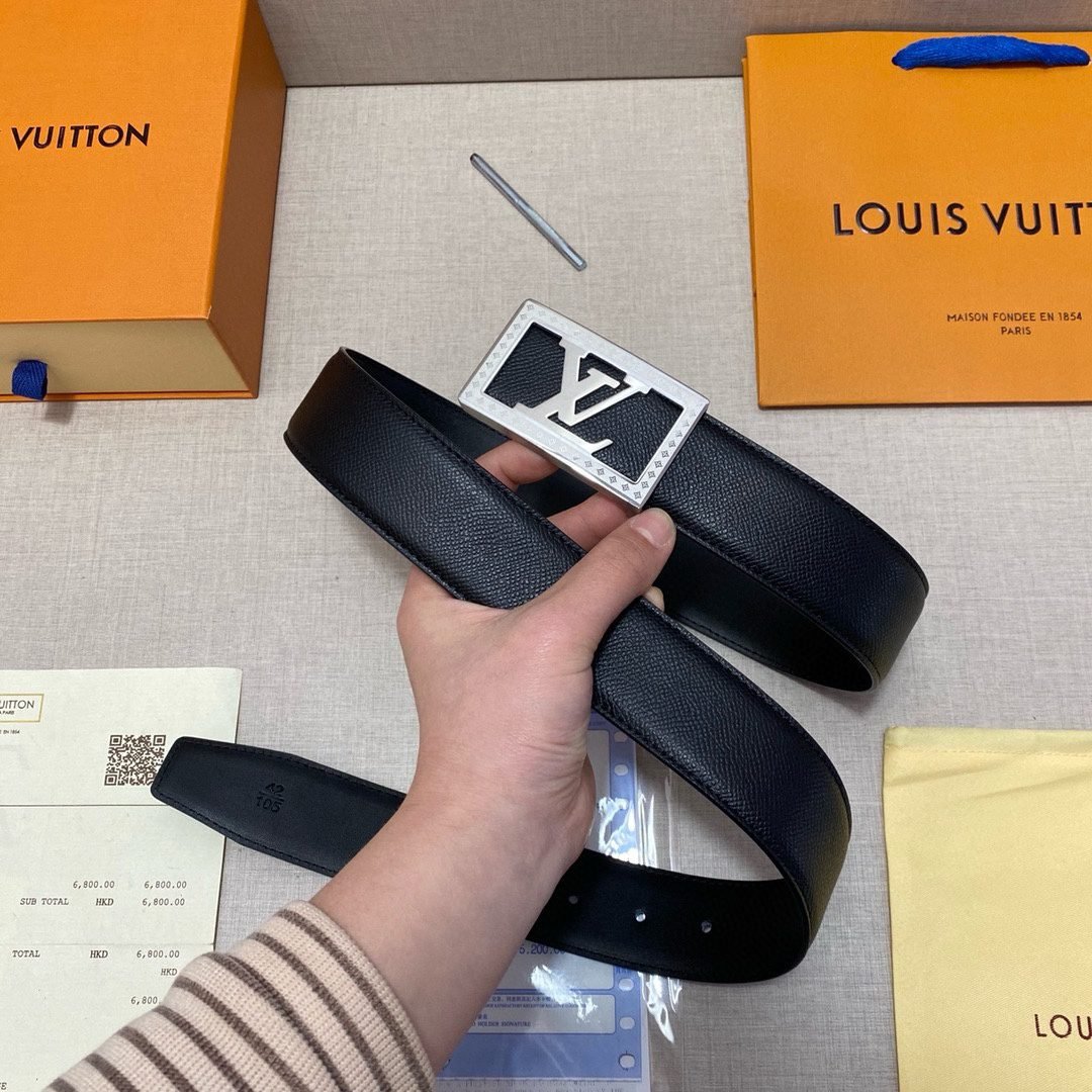 This Louis Vuitton black belt with silver square buckle is made of top-grade leather material, and the black tone shows calmness and grandeur. The unique silver square buckle is engraved with the classic “LV” logo, highlighting the wearer’s distinguished status and unique taste.