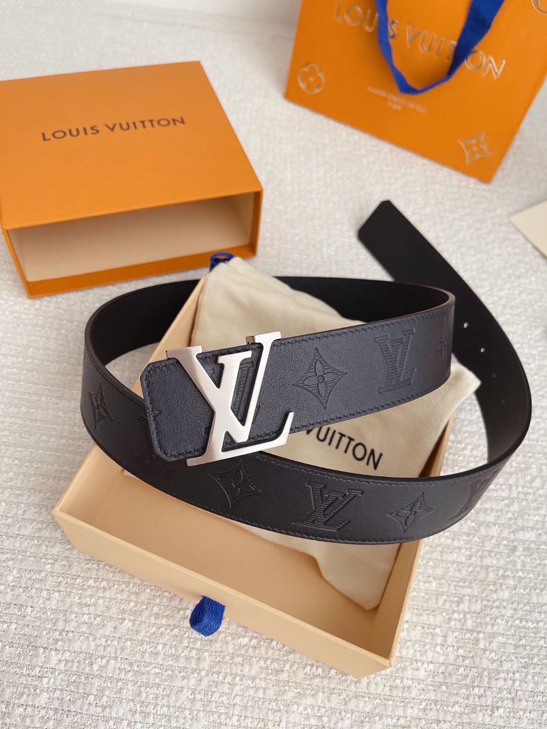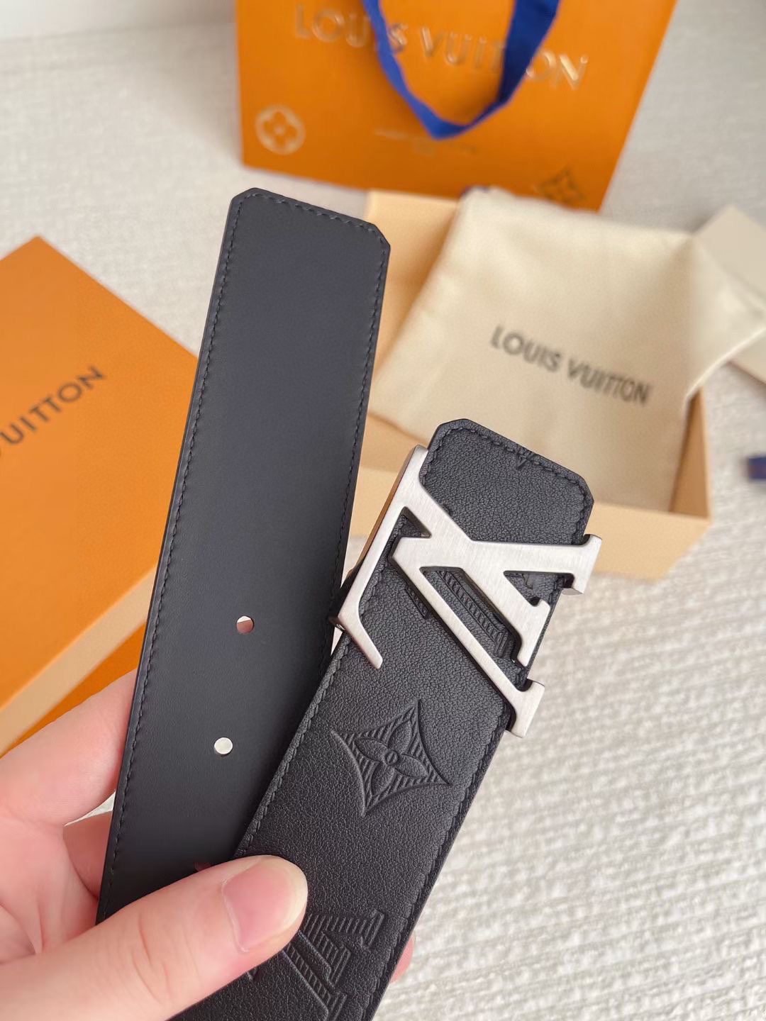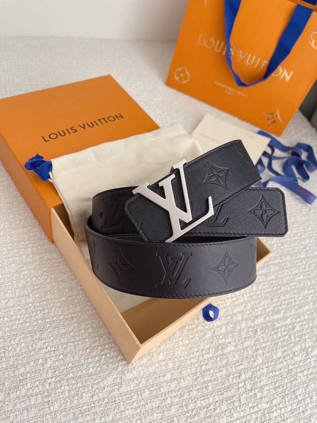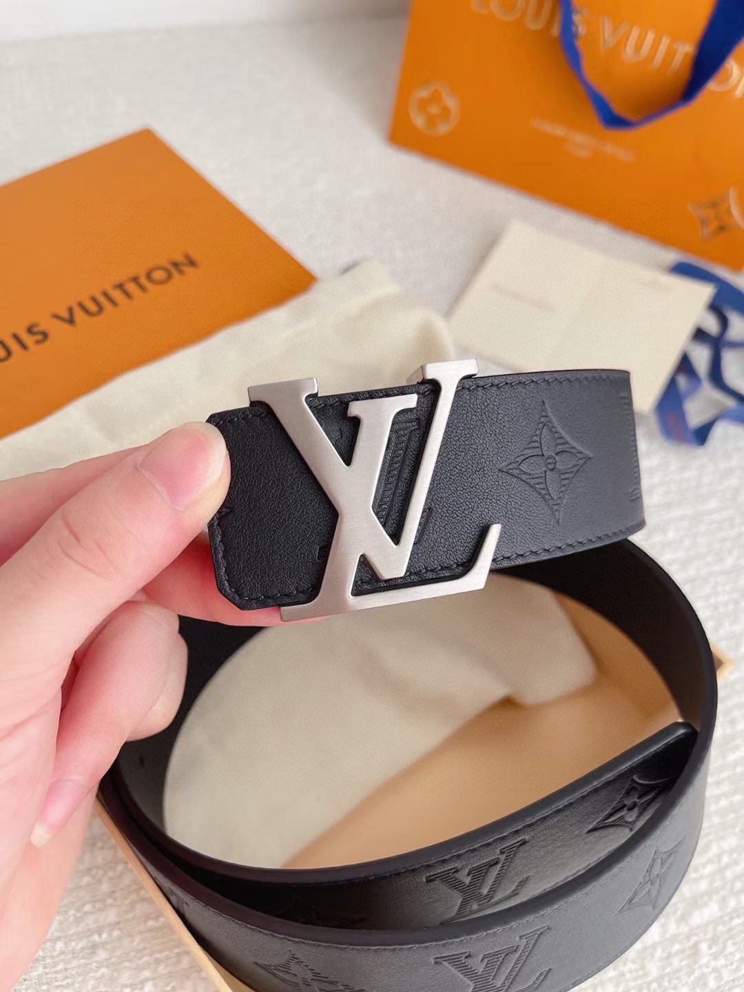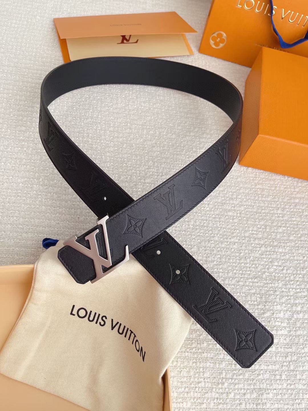 Louis Vuitton’s silver V-buckle and black textured belt has become a classic in the fashion industry with its unique design and noble temperament. It is made of top-grade leather material and undergoes exquisite hand-embossed process to present a delicate and unique texture, which is soft and elastic to the touch. The belt buckle is inlaid with a delicate silver “LV” logo, highlighting the brand’s nobility and uniqueness.
