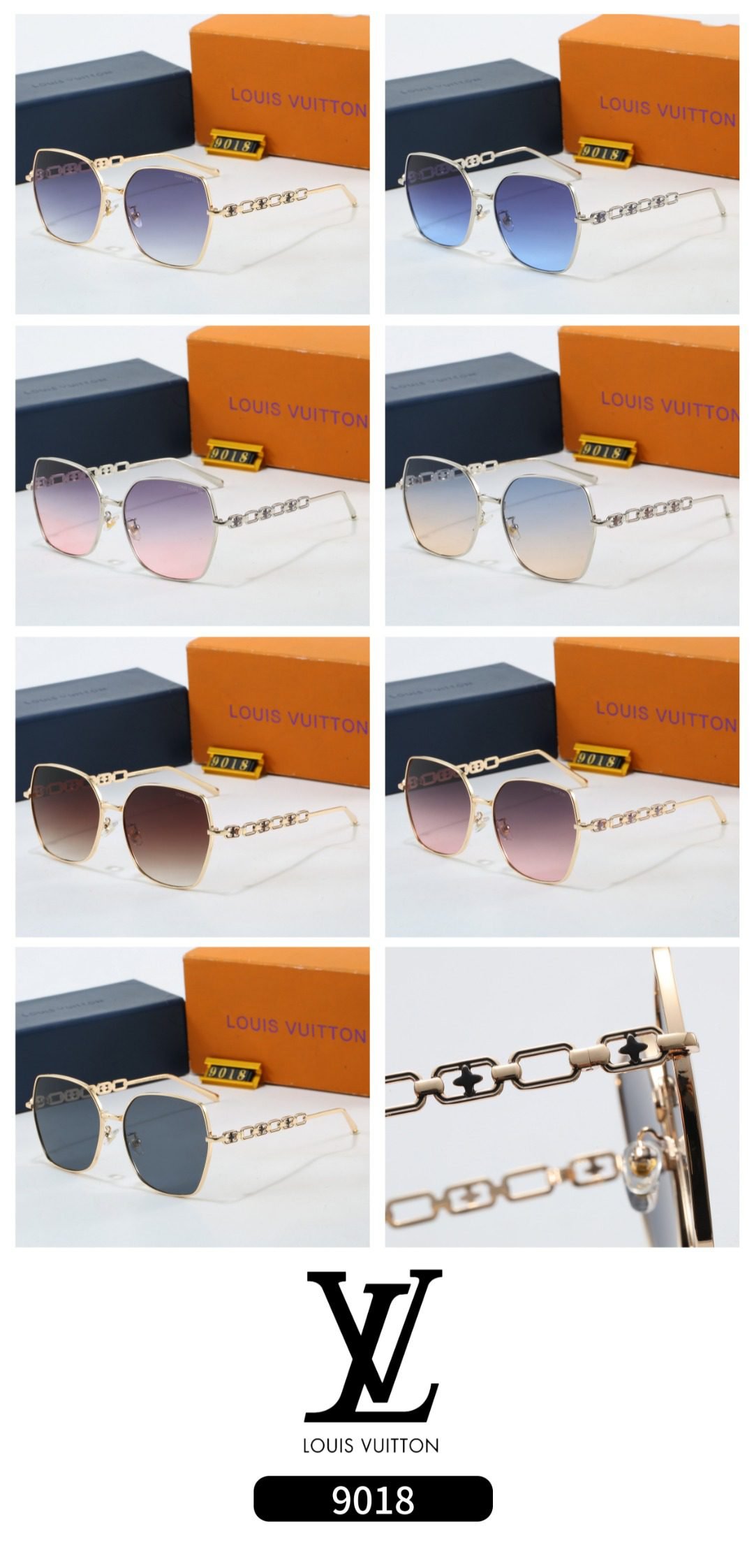 Elevate your accessory collection with Louis Vuitton’s sunglasses (Model 9018). Featuring a range of stylish options—from frames with elegant chain detailing in gold and silver tones to designs with gradient – tinted lenses in purple, blue, pink, and more—these sunglasses blend a chic silhouette with the brand’s signature luxury.