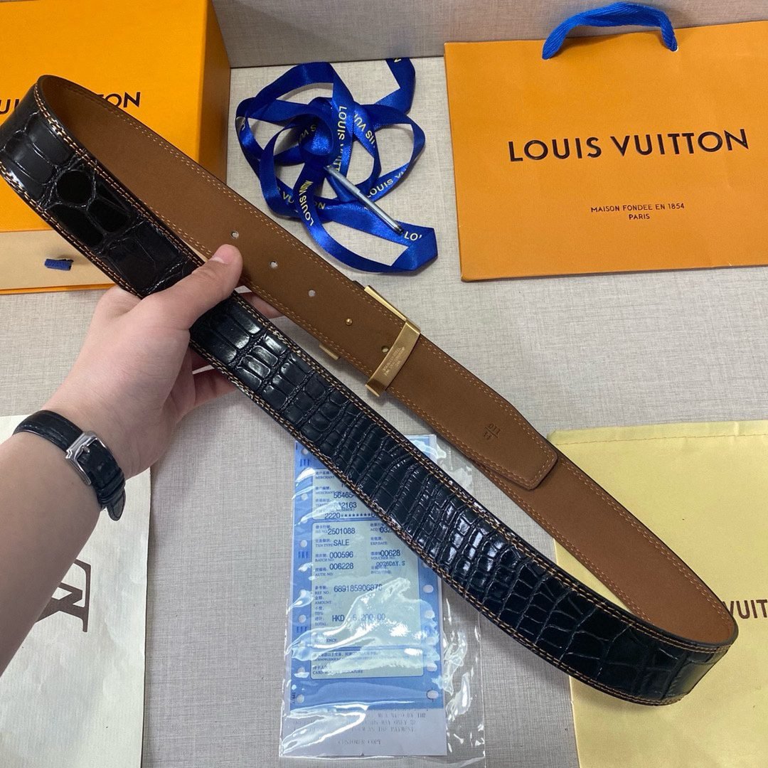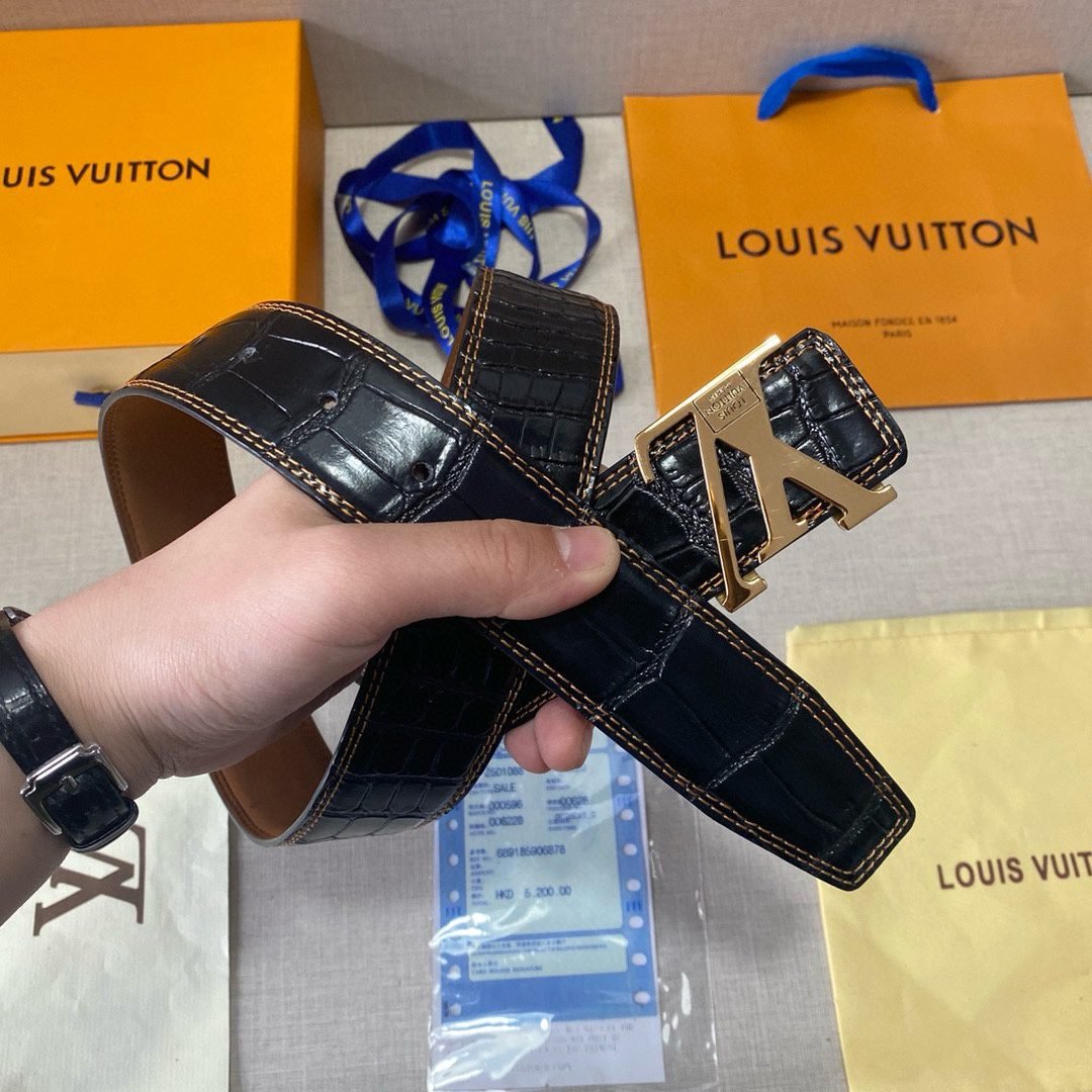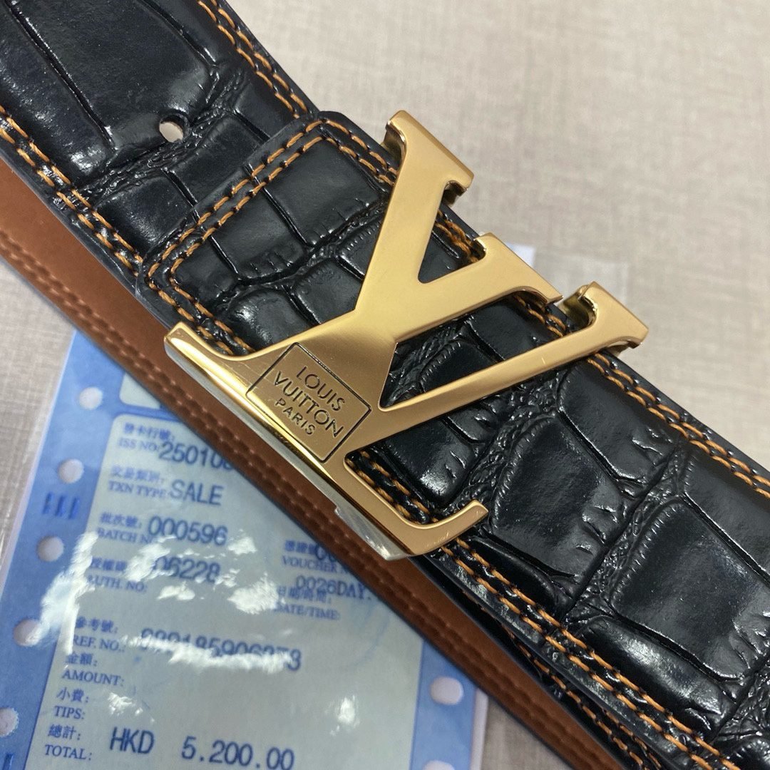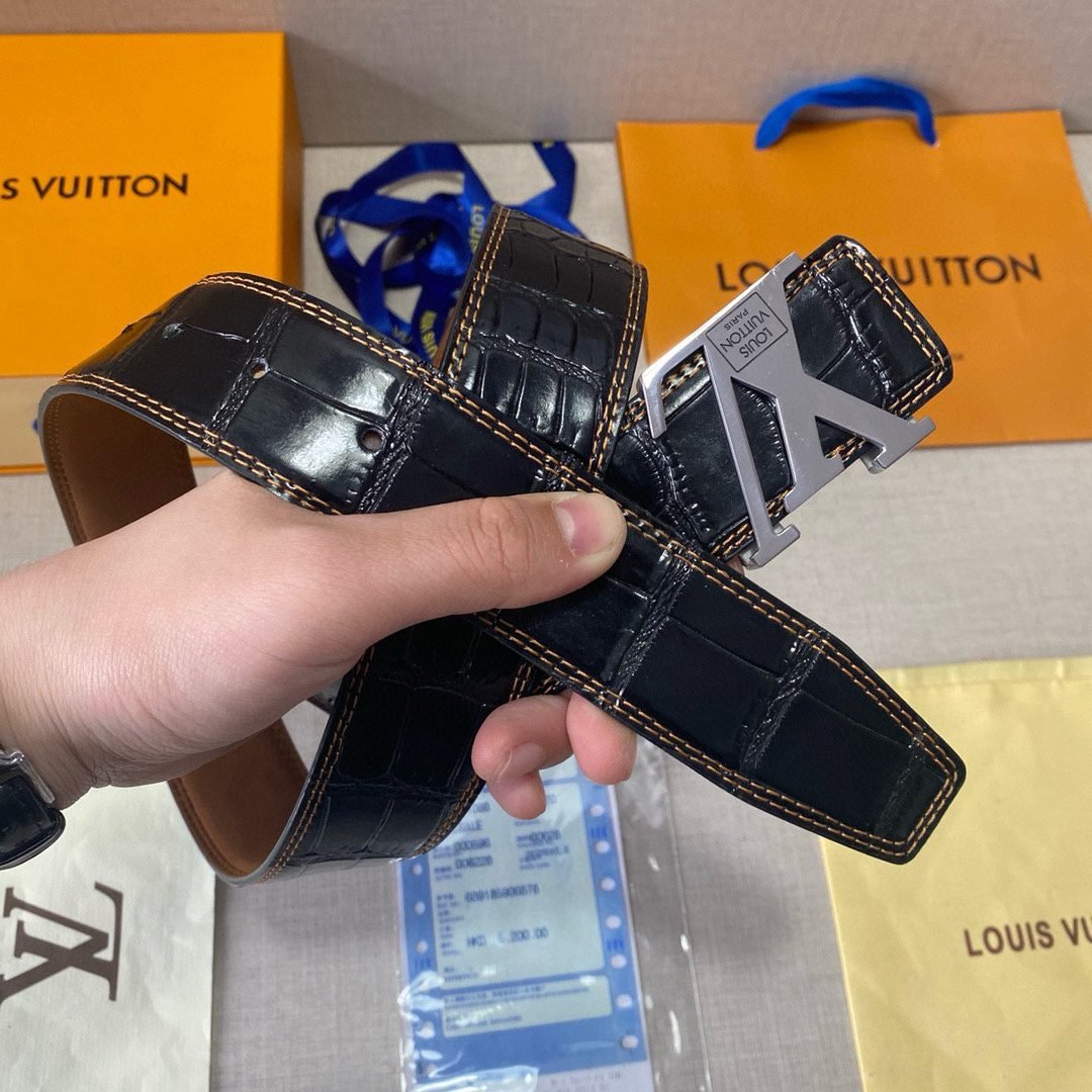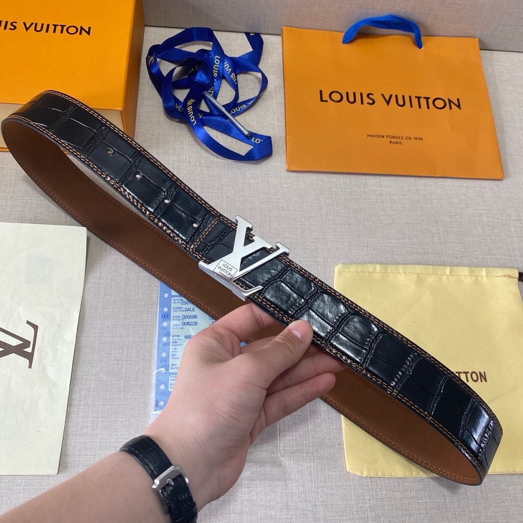 This Louis Vuitton V-shaped buckle black crocodile pattern belt is made of rare black leather, showing unparalleled luxury and nobility. The surface of the belt has clear texture and high gloss. You can feel its delicate texture and comfortable touch every time you touch it. The unique metal “LV” logo is inlaid on the belt buckle head, which is simple and elegant, highlighting the unique charm of the brand.