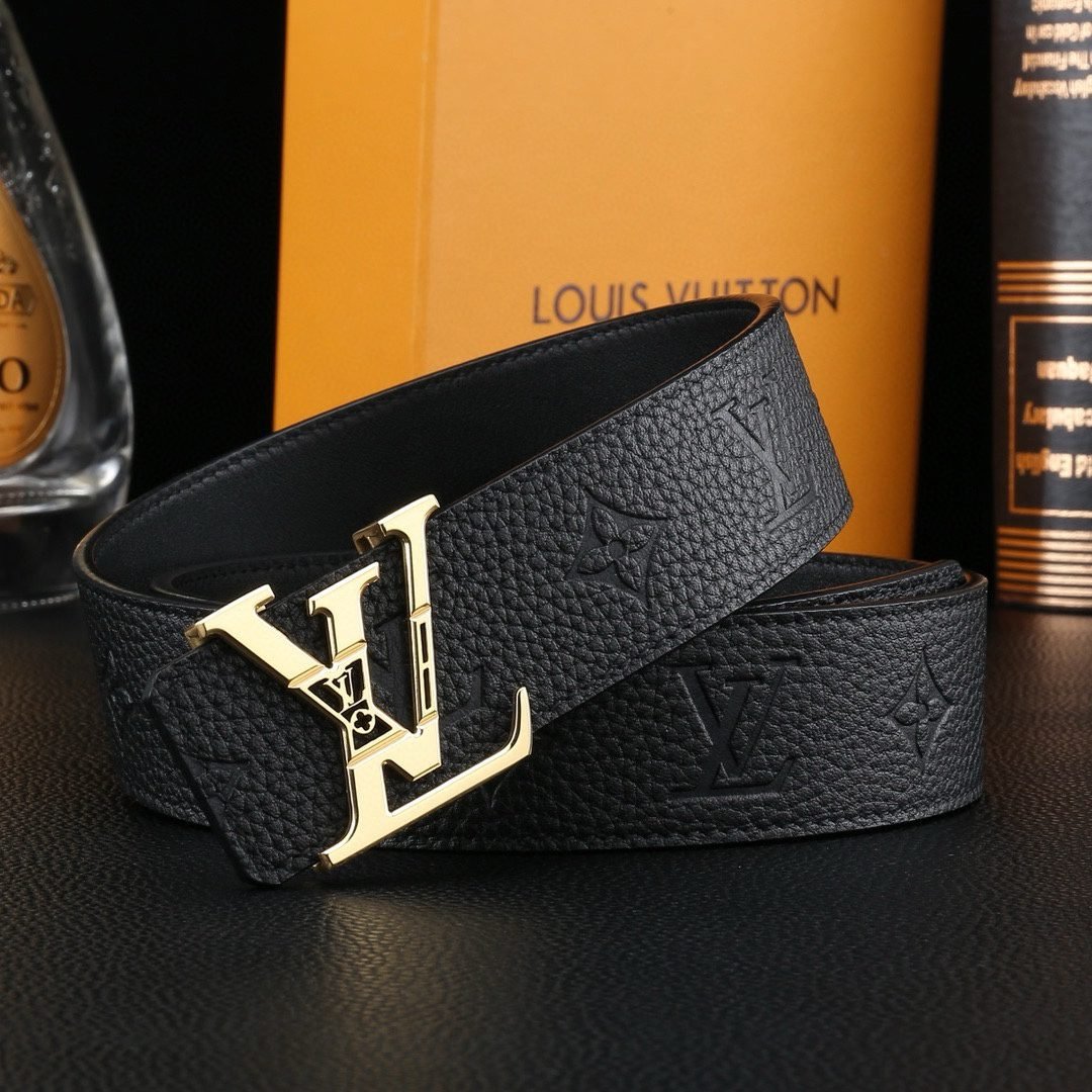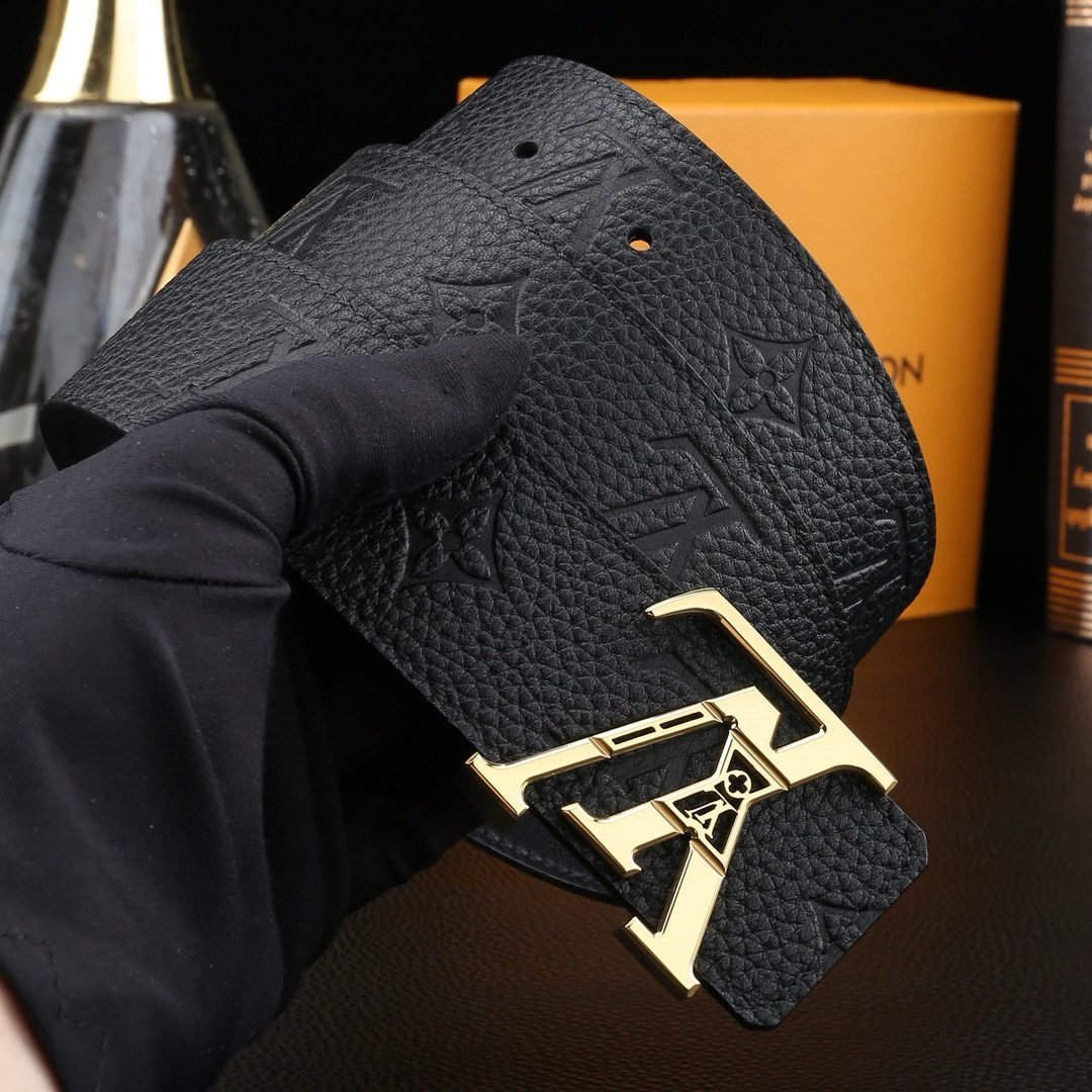Louis Vuitton’s V-buckle black textured belt perfectly blends elegance and luxury. Selected high-quality leather material, finely polished and treated with unique techniques, showing unique texture and luster, soft and delicate touch, highlighting extraordinary texture. The belt buckle head is made of high-grade metal material and is exquisitely inlaid with Louis Vuitton’s iconic “LV” letters. The golden luster shines brightly, showing the wearer’s noble taste and unique personality.