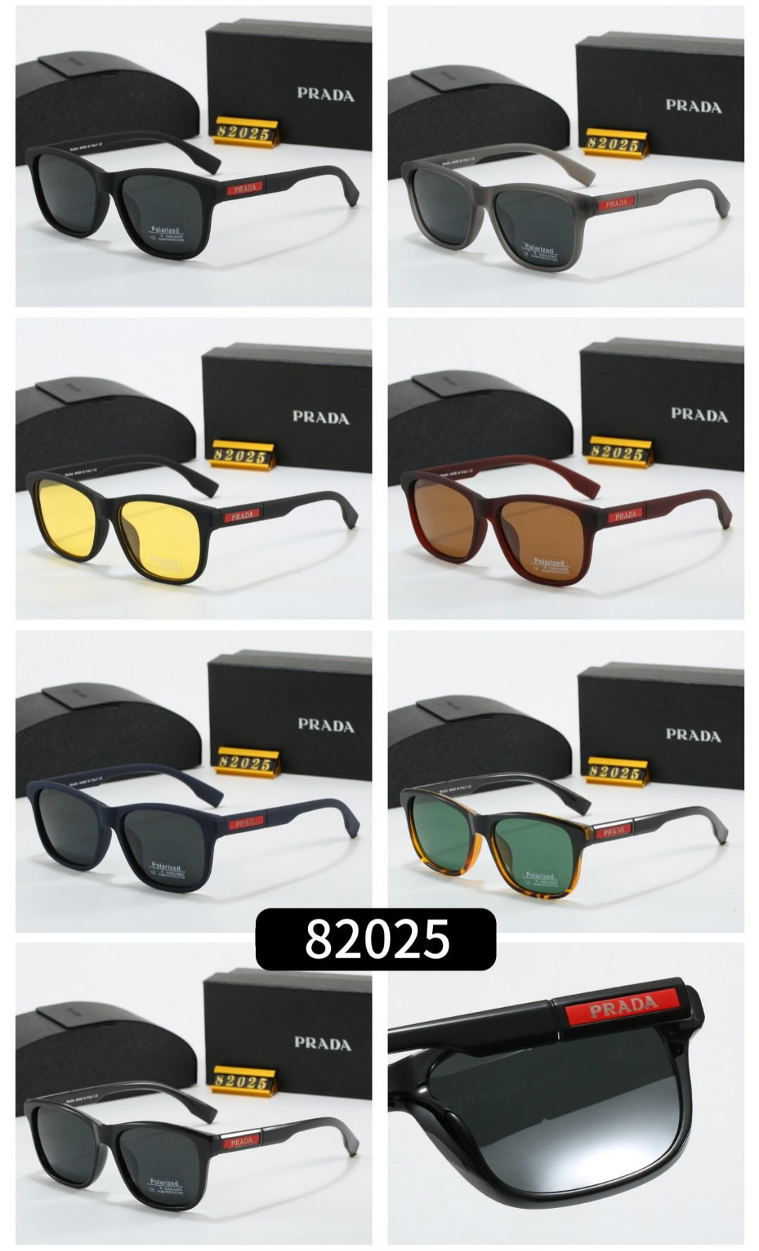 Elevate your accessory collection with Prada’s square sunglasses (Model 82025). Featuring classic square frames, they come in a range of stylish options—from sleek black with dark lenses, gray frames with dark lenses, bold black frames with bright yellow lenses, rich brown frames with warm brown lenses, to deep navy frames with dark lenses, frames with green lenses and tortoiseshell accents, and more.
