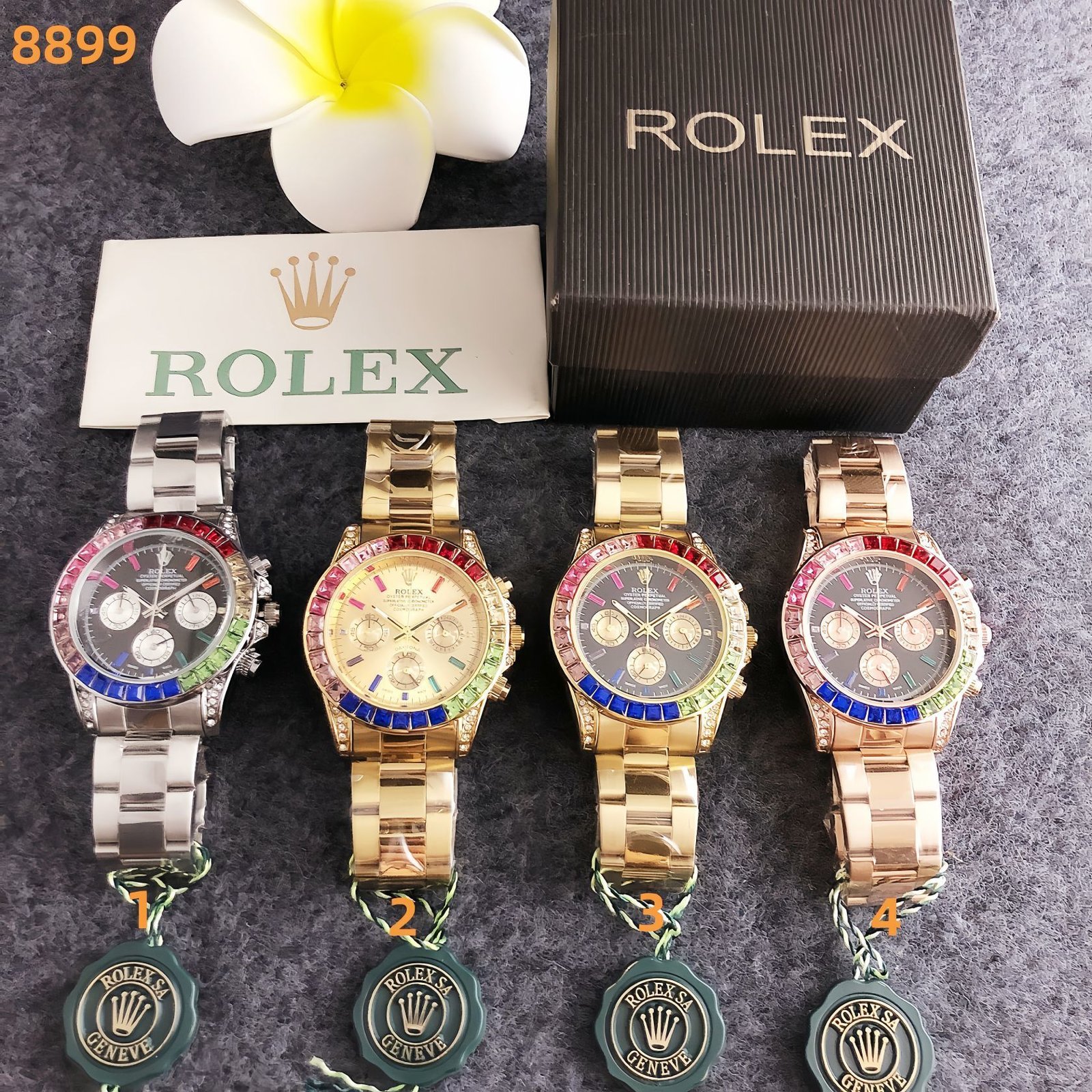 Rolex 8899 series watches merge bold color artistry with precision horology, featuring multi-function chronograph dials, striking multi-colored crystal-encrusted bezels, and sleek metal bracelets in tones like silver, gold, and rose gold. With Rolex’s signature attention to detail and legacy of technical excellence, these timepieces exude dynamic glamour. Perfect for those who crave a fusion of vibrant style and luxurious sophistication, they make a standout statement suitable for both energetic pursuits and high-end social scenes.