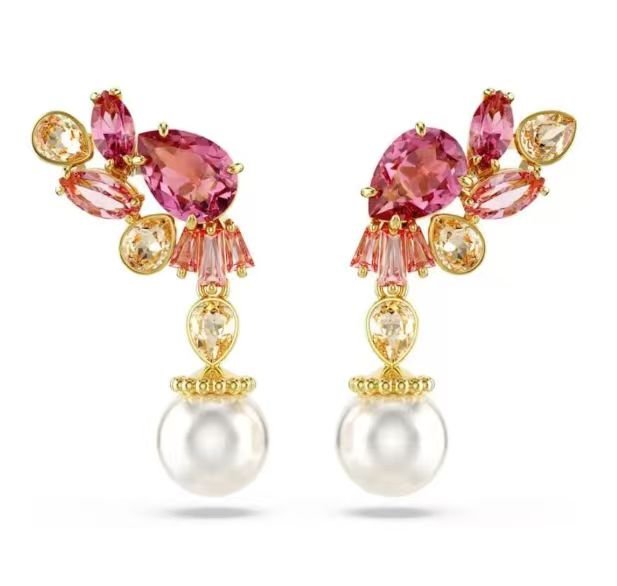 These stunning drop earrings from Swarovski showcase a masterful blend of vivid pink and warm – hued Swarovski crystals, meticulously arranged to mimic a charming floral motif. Each earring gracefully suspends a lustrous white pearl, exuding an air of timeless elegance. Ideal for elevating your style quotient, whether it’s a formal event or a special occasion, these earrings are a true statement of luxury and refinement.