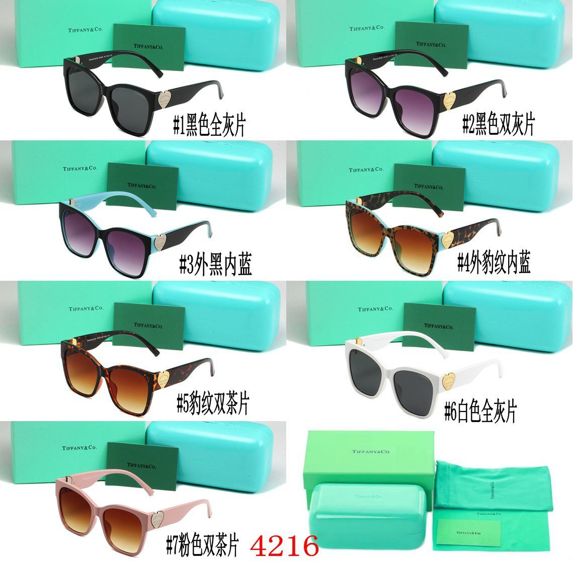 Tiffany & Co. 4216 series sunglasses offer a rich array of styles to cater to various fashion preferences. You can find options like all – black with gray lenses, black with dual gray lenses, outer black with inner blue, outer leopard print with inner blue, leopard print with dual brown lenses, pure white with all – gray lenses, and pink with dual brown lenses. Each pair seamlessly blends the brand’s classic elegance with trendy designs. Whether you’re going about your daily routine or attending a special event, these sunglasses are perfect for adding a touch of luxury and charm to your outfit.