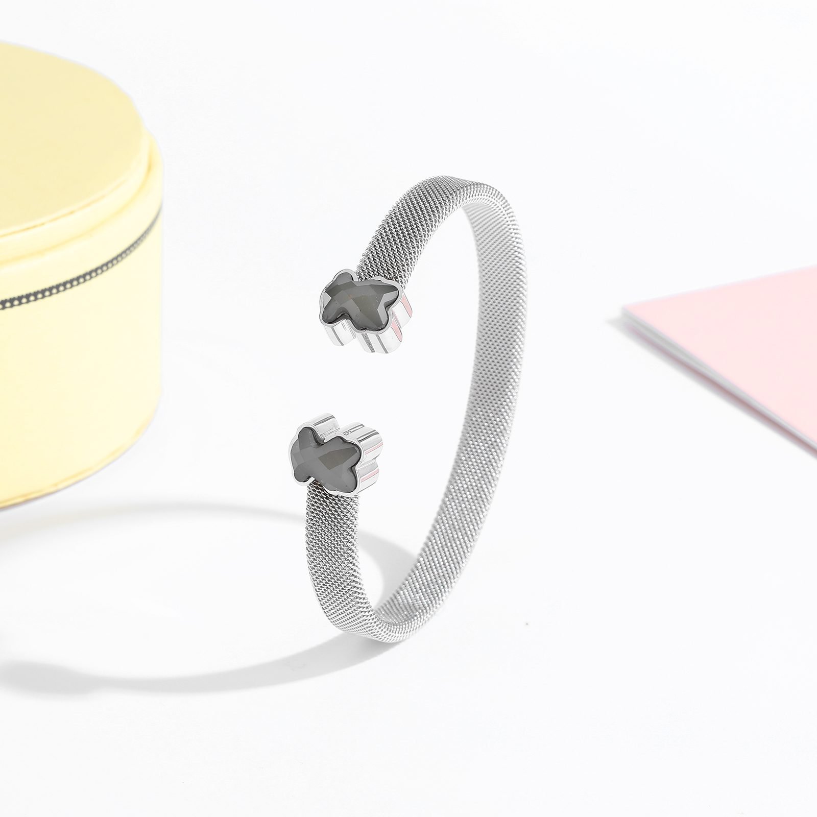 TOUS, This jewelry brand, originating from Spain and full of fairy tale colors and warm emotions, once again presents you with a simple yet personalized 925 silver minimalist purple and gray bear opening bracelet with exquisite design. This bracelet not only combines classic and modern aesthetic concepts, but also becomes the finishing touch in your daily wear with its unique charm. Selected high-quality 925 sterling silver as the main material, ensuring that every side of the bracelet shines with a warm and pure luster. The superior characteristics of 925 silver make this bracelet not only exquisite in appearance, but also excellent in durability and skin friendliness, suitable for long-term wearing of various skin types, without fear of allergy troubles. The design inspiration for the bracelet comes from the iconic teddy bear image of TOUS, which has been cleverly conceived and carefully crafted by the designer to present a simple yet cute style. The shape of the little bear is outlined with delicate lines, with a cute and innocent appearance, as if lying quietly on your wrist, conveying a message of warmth and companionship. What is even more remarkable is that this bracelet cleverly uses a combination of purple and gray colors. Purple symbolizes mystery and nobility, adding a touch of romance and fantasy to the bracelet; Grey, on the other hand, complements purple perfectly with its low-key and introverted qualities, making the entire bracelet look both fashionable and exude a calm and introverted temperament.