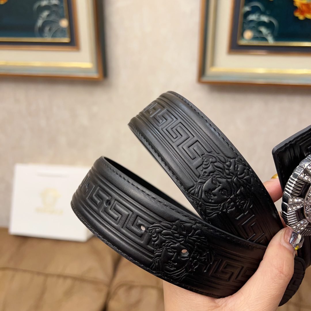 Versace silver square buckle with black texture belt, simple, fashionable, noble, and elegant