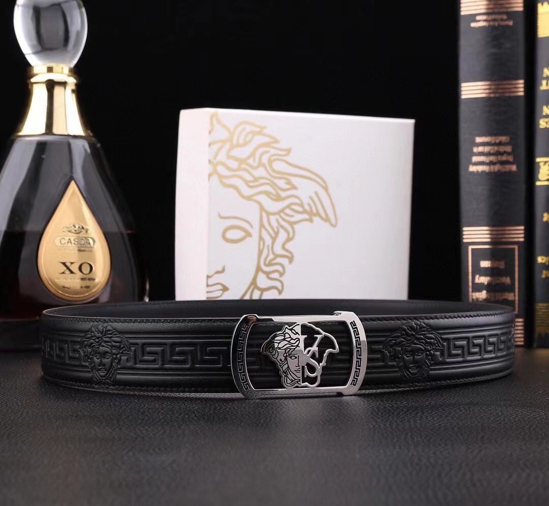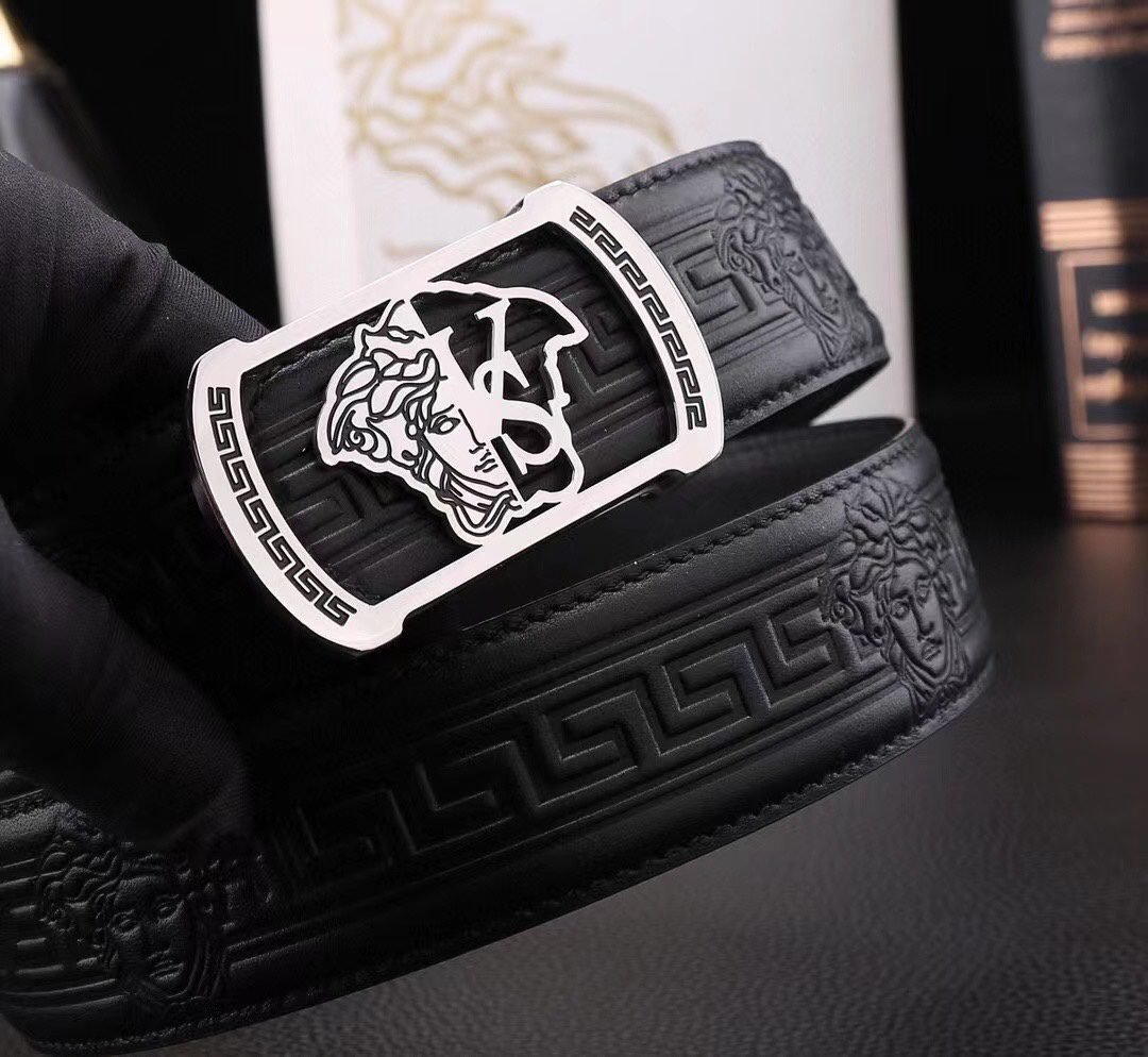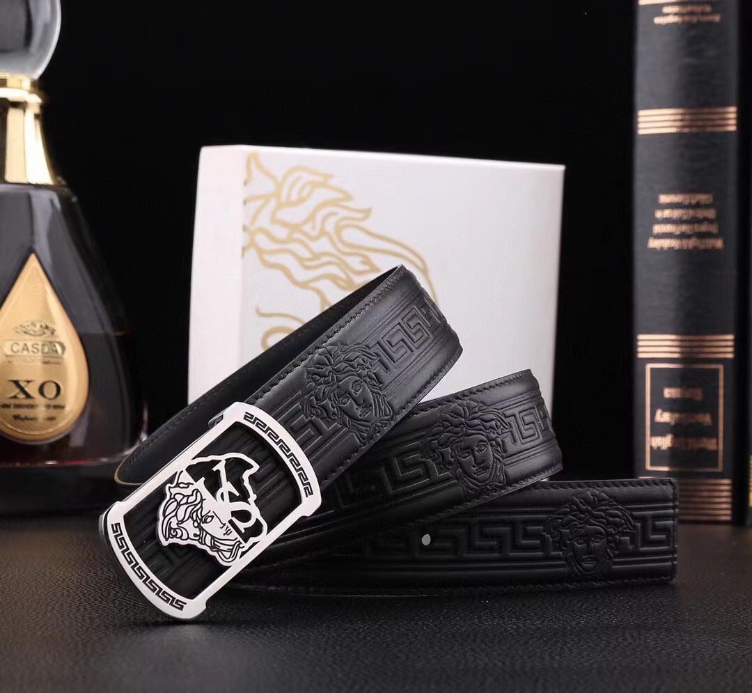 Versace silver square buckle with black belt, simple and elegant, classic and fashionable